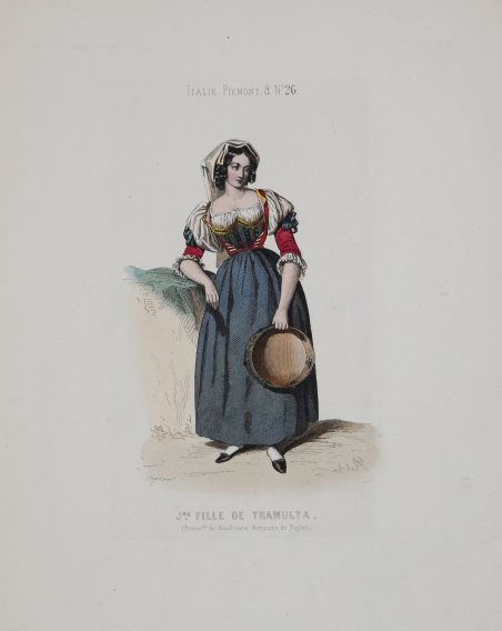 Fanciulla in tipico costume con un tamburello in mano. ' Litografia con fine coloritura coeva, in ottimo stato di conservazione. ' Lithograph with fine original colouring, in very good condition. Cfr.