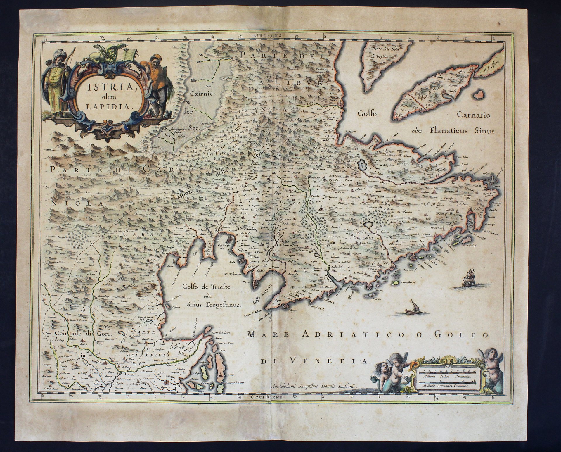 Carta dell'Istria, firmata in lastra da Johannes Janssonius (1588-1664), cartografo, editore e incisore olandese, che aveva collaborato all'impresa dell'Atlas Maior di Henricus Hondius.