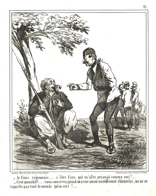 Je fous régonnais.c'etre fous qui m'afre arrangé comme ceci!- C'est possible! vous concevez, quand on a une aussi nombreuse clientelle, on ne se rappelle pas tout le monde qu'on sert! | Stampe | Cham dis. & Destouches lith.