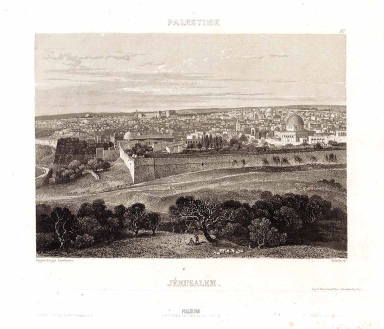 Stampa, antica ed originale, con veduta panoramica di Gerusalemme. Inserita nell'opera "Excursions photographiques. Vues et monuments les plus remarquables de l'univers.". Parigi 1863. Autore: Salathé sculp. Luogo: Gerusalemme. Anno: 1863. Tecnica: acquatinta. Dimensioni: 270x370 il foglio.