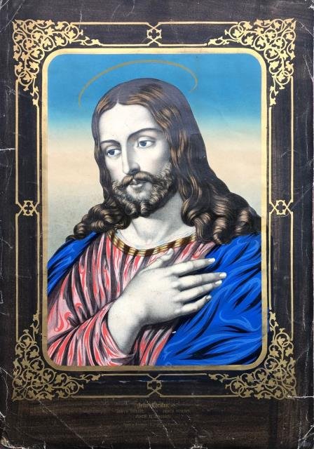 Druck u. Verlag E. G. May in Frankfurt a. M. Senza indicazione di data ma 1840 circa. Litografia in coeva coloritura a mano con bordura e decorazioni oro agli angoli, cm 33 x 47,5 (il foglio). Bella immagine religiosa del Gesù raffigurato in primo piano in cui esalta lo splendido blu della veste. Difetti marginali con un paio di piccoli forellini della carta, splendida la coloritura, nell'insieme buona conservazione.