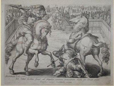 Incisione in rame di mm 225x295 con rappresentazione di una tenzone vinta da Giovanni de' Medici (1498-1526), detto "delle bande nere", valente condottiero delle forze papali. L'incisione appartiene a una rarissima serie di 21 tavole dedicate alla storia della famiglia Medici (Mediceae Familiae rerum feliciter gestarum Victoriae et Triumphi.). La serie si divide in tre parti: la prima è dedicata alle vittorie di Carlo V e Cosimo de' Medici, la seconda, composta da 8 tavole di cui la presente è la seconda, a "I fatti d'armi di Giovanni de' Medici" e la terza infine all'incoronamento di Cosimo de' Medici. La tavola è stata incisa da Galle su disegno di Jan van der Straet (Johannes Stradanus). Buon esemplare con qualche traccia di sporco superficiale. <BR>Bibliografia: Hollstein 462-483, Le Blanc 122-143, Strauss 12-16, Bartsch (Goltzius) 258-289, Bartsch (Galle) 102.1-16.