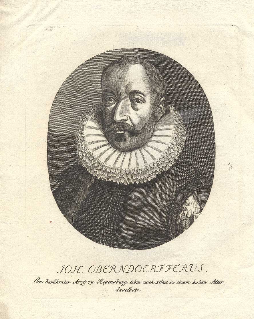 Cm. 14,5x18,5 (al vivo), incisione originale su rame, ritratto del medico Oberndoerfferus. In buono stato (good copy).
