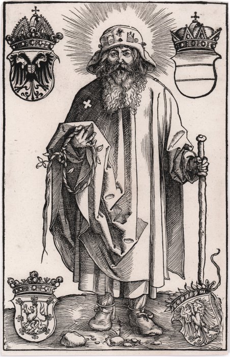 Xilografia, 1513, senza monogramma. In una lettera indirizzata a Dürer da Nikolaus Kratzer (1486-155), astronomo di corte del re Enrico VIII d'Inghilterra, Kratzer chiede a Dürer: "Ti prego di mandarmi il ritratto di Stabius, raffigurato come San Kolman, tagliato in legno". La paternità dureriana di questa xilografia non è stata ancora accettata da tutti. Strauss la include tra le xilografie per la forte possibilità che sia basata su un disegno di Dürer, forse frettoloso, e poi tagliata nel blocco senza la sua super visione. Dodgson attribuisce questa stampa a Springinklee, come fa Meder, mentre Schoch afferma che la figura è disegnata troppo bene per essere stata disegnata da Springinklee. L'assenza del suo monogramma non può essere necessariamente interpretata come un'indicazione che Dürer non sia l'autore, perché la xilografia serviva come illustrazione di un foglio accompagnato da un'ode saffica di Stabius, e recante, sopra l’immagine, il seguente testo 'Divo Colomanno martyri sancto: Austrieque patrono/ presentissimo: Joann. Stabius. Au. voti reus. Hoc/ carmen dedicat. Anno dni. etc. M.D.xiij' Dürer conosceva bene Johannes Stabius (morto nel 1522), filosofo e astronomo di corte dell'imperatore Massimiliano. Stabius accompagnò l'imperatore nella sua visita a Norimberga, 3-15 febbraio 1512, ma a quanto pare rimase più a lungo perché il 30 luglio ha preparato un oroscopo a Norimberga per Matthäus von Gurk . Stabius è qui raffigurato nelle vesti di San Colomanno, venerato in Austria. Il santo fu impiccato nel 1020 a Stockerau. Indossa un cappello da pellegrino e tiene nella mano sinistra una frusta intrecciata. I quattro stemmi sono (in senso orario) quelli dell'Impero, dell'Arciducato d'Austria, della Scozia e di Stabius. San Colomanno, secondo la leggenda, era un discendente della famiglia reale scozzese. Magnifica impressione, impressa su carta vergata con filigrane doppia croce e lettere ICP”, in perfetto stato di conservazione. Esemplare nella seconda edizione descritta da Meder e pubblicata da Adam von Bartsch utilizzando la matrice originale conservata all’Albertina di Vienna e datata 1781. Woodcut, 1513, without monogram. In a letter, addressed to Dürer by Nikolaus Kratzer (1486-155), court astronomer to King Henry VIII of England, Kratzer asks Dürer: “I beg you to send me the portrait of Stabius, portrayed as Saint Kolman, cut into wood. "Yet Dürer's authorship of this woodcut has not gained general acceptance Dodgson attributes this print to Springinklee, as does Meder, while Schoch states that the figure is drawn too well to have been designed by Springinklee. Strauss included it among on Dürer’s woodcuts because of the very strong possibility that it is based on a drawing by Dürer, perhaps a hasty one, due to his preoccupation with the master engravings of this period, and then cut into the block without his super vision. The absence of his monogram cannot necessarily be construed as an indication that Dürer was not the author because the woodcut served as illustration of a broadsheet accom panied by a sapphic ode by Stabius, lettered above the woodcut on left sheet: 'Divo Colomanno martyri sancto: Austrieque patrono presentissimo: Joann. Stabius. Au. voti reus. Hoc carmen dedicat. Anno dni. etc. M.D.xiij' ' Dürer was well acquainted with Johannes Stabius (d. 1522), philosopher, and court astronomer to Emperor Maximilian (see the following woodcuts). Stabius accompanied the emperor on his visit to Nuremberg, 3-15 February 1512, but apparently stayed on for some time because on 30 July he prepared a horoscope at Nuremberg for Matthäus von Gurk. Stabius is pictured here in the guise of St. Coloman, venerated in Austria. The saint was hanged in A.D. 1020 at Stockerau. Wearing a pilgrim's hat, he is holding in his left hand a braided whip. The four coats of arms are (clockwise) those of the Empire, the Archduchy of Austria, Scotland, and of Stabius. St. Coloman, according to legend, was a descendant of the Scottish royal family” (cf. Strauss. p. 483). Example of the second issue described by Meder, printed by Bartsch from the block in the Albertina dated MDCCLXXXI. A fine impression, printed on laid paper with “ICP with Doublecross” watermark, perfect condition. Cfr. Bartsch, 106; Meder n. 194; TIB 1001.306 (137): Strauss, p. 483-485, n. 169.