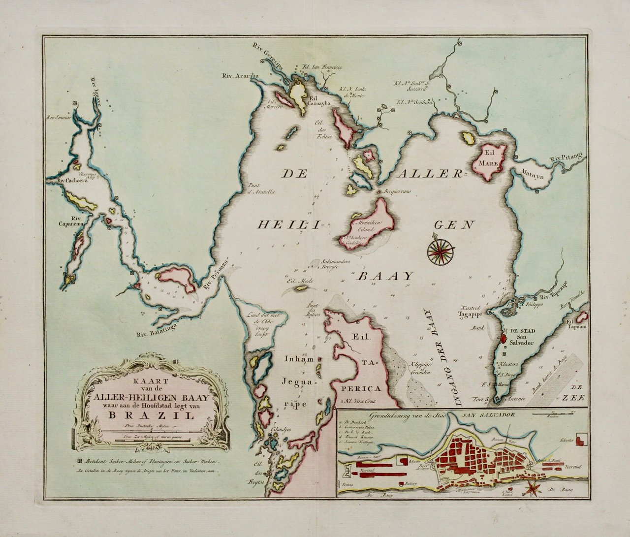 Copper engraving, mm 346x400, original colour. Map of Salvador and the Baia de Todos os Santos (All Saints' Bay) in the state of Bahia in Brazil. Very good condition. The map depicts the region, including the entirety of the bay, from the south, with Salvador and the entrance to the bay located in the lower right corner. Numerous rivers and streams are illustrated emptying into the bay, the larger of which are labeled. Small symbols, a square surrounding a circle, are scattered throughout, mostly along rivers or on the shores of the bay. These symbols indicated the location of a sugar plantation or mill, one of the major exports from Brazil during the 18th century. Numerous depth soundings are included throughout the bay, with the highest concentrations appearing around what appears to be the bay which allows access to San Salvador and along what must be the most common routes within the bay. An inset map of San Salvador, known today as Salvador, is situated in the lower right corner. This inset map details the layout of the city, and labels several locations within the city, employing a small alphabetic key for a handful of these locations.<BR>Isaak Tirion (1705 - 1765) was a Dutch publisher in Amsterdam. Born in Utrecht, Tirion quickly rose to prominence by publishing pamphlets, historical works, and most importantly, maps and atlases. He produced several atlases and Dutch town plans. His maps are mainly based on those of Guillaume de l'Isle. Tirion eventually relocated his printing house to the prestigious Kalverstraat. In his long career, he produced eight atlases in multiple editions, some of which were published posthumously until about 1784<BR><BR>