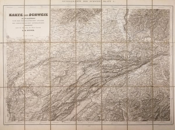 Grande e bella carta geografica della Svizzera (cm. 154 x 112), inc. in rame e montata su tela; è ripartita su 4 fogli (di cm. 56,5 x 77,5), ciascuno suddiviso in 21 riquadri. Prima edizione. Le 4 parti della carta geografica, pubblicate tra il 1867 e il 1873, sono relative a: I - Nordwestblatt / II - Nordostblatt / III - Südwestblatt / IV - Südostblatt. Sono contenute in una custodia in cartonato coevo (cm. 20x12), ben conservate.