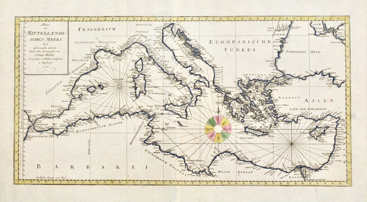 Incisione in rame, mm 295x580, coloritura d'epoca ai confini. Ottimo esemplare ad ampi margini di questa non comune carta nautica. Riquadro con titolo in alto a sin. Semplice rosa dei venti al centro.<BR>Copperplate, original colour, mm 295x580. A scarce german nautical map of the Mediterranean Sea. Very good condition, full margins. <BR>