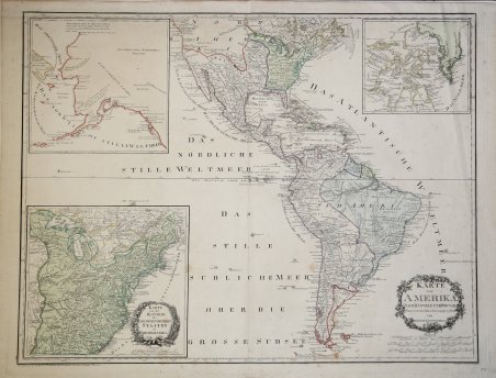 Dal primo atlante del mondo ad essere prodotto da un austriaco, la "Grosse Deutscher Atlas", questa è una mappa interessante e delicatamente incisa delle Americhe. Sono inclusi tre piani incassati che mostrano i tredici Stati Uniti d'America, Alaska e lo Stretto di Cook, e, della Baia di Hudson e la Groenlandia. Il tutto è ben dettagliato con colore utilizzato per definire i territori. Il cartiglio del titolo appare in una cornice floreale in basso a destra e il nome dell'incisore è dato anche nell'angolo in basso a sinistra. Una mappa attraente di grande formato da un cartografo relativamente raro. From the first world atlas to be produced by an Austrian, the "Grosse Deutscher Atlas", this is an attractive and delicately engraved map of the Americas. Included are three inset plans showing the thirteen United States of America; Alaska and the Cook Strait; and, Hudson's Bay and Greenland. The whole is well detailed with colour used to define territories. The title cartouche appears in a floral surround at lower right and the engraver's name is also given in the lower left corner. In North American Reilly displays the young United States in Green extending from the Atlantic Seaboard to the Mississippi river exclusive of Florida. Spanish Dominions at this time extended from Florida to the Pacific and included former French Louisiana (demarked as the area between the Mississippi River and the Sabine River). In South American the Spanish dominated the entire Pacific seaboard with Portuguese Brazil in Blue. Dutch and French colonies in Surinam and and French Guyana are noted. The three insets, being quite large and detailed, bear special note. The largest of the three insets details the United States. This map, extending from the Atlantic to the Mississippi River is copiously detailed with fascinating annotations in German describing to American Indian lands and Revolutionary War events. This is the only of the three inset maps to have its own decorative cartouche.A large map of Alaska appears in the upper right. The Bering Strait is detailed as are some of the Aleutian Islands. Being largely unknown at this time, it is unusual to find such a large inset map detailing such a relative unexplored region. The interior of Alaska is blank, but the coast reflects explorations by Cook (1778), Captain George Dixon (1787), and an unidentified Spanish expedition (probably Juan Perez, 1773). The third inset map detailed the region between the Hudson Bay and Greenland The map offers impressive detail and extensive annotation regarding possible inland waterways leading westward. General interest in the possibility of a Northwest Passage is probably the reasoning behind both this map and that of Alaska on the opposite side of the map.An attractive large format map by a relatively uncommon mapmaker. Cfr.