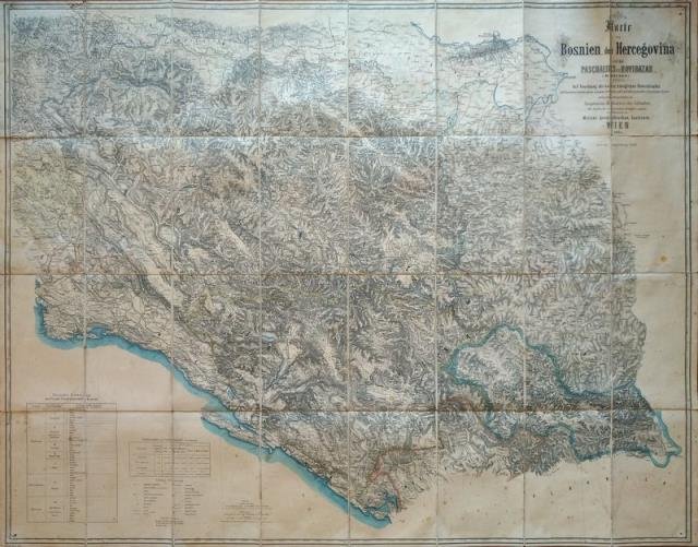 Karte von Bosnien der Hercegovina und des Paschaliks von Novibazar (Rascien). Auf Anordnung des kaiser. königlichen Generalstabes nach den neuesten Quellen, und mit Ausnahme der Kraina an Ort und Stelle gesammelten orographischen Skizzen, entworfen und gezeichnet von Hauptmann Roskiewicz des Grlstabes. Mit Theilen der angrenzenden Provinzen ergänzt.