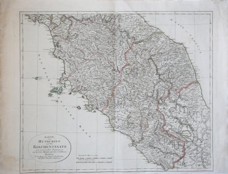 Karte von Hetrurien und dem Kirchenstaate nach astronomischen Bestimmingen und den besten Hilfmitteln gezeichnet v. Conr. Mannert. Nurberg in der Kaysl. privi. Kunstu: Buchhandlung Ad: Gottl: Schneider u. Weigels, 1803. Rarissima carta geografica dello Stato della Chiesa con la Toscana stampata a Norimberga dalla tipografia Schneider und Weigel. Adam Gottlieb Schneider und Weigel (1794-1805) è stata un'azienda editoriale tedesca con sede a Norimberga. Adam Gottleib Schneider und Weigel è il nome con cui l'azienda di Christoph Weigel (1654 circa - 1725) pubblicò dopo la collaborazione con Adam Gottlieb Schneider (1745 - 1815) nel 1794. La ditta impiegò Conrad Mannert come incisore e pubblicò solo poche mappe, la maggior parte delle quali sono eccezionalmente rare. Stilisticamente l'opera di Schneider e Weigel si inserisce nella tradizione tedesca stabilita da Homann, Seutter e Lotter. Acquaforte, coloritura coeva dei contorni, in ottimo stato di conservazione. Karte von Hetrurien und dem Kirchenstaate nach astronomischen Bestimmingen und den besten Hilfmitteln gezeichnet v. Conr. Mannert. Nurberg in der Kaysl. privi. Kunstu: Buchhandlung Ad: Gottl: Schneider u. Weigels, 1803. Rarissima carta geografica dello Stato della Chiesa con la Toscana stampata a Norimberga dalla tipografia Schneider und Weigel. Adam Gottlieb Schneider und Weigel (1794-1805) è stata un'azienda editoriale tedesca con sede a Norimberga. Adam Gottleib Schneider und Weigel è il nome con cui l'azienda di Christoph Weigel (1654 circa - 1725) pubblicò dopo la collaborazione con Adam Gottlieb Schneider (1745 - 1815) nel 1794. La ditta impiegò Conrad Mannert come incisore e pubblicò solo poche mappe, la maggior parte delle quali sono eccezionalmente rare. Stilisticamente l'opera di Schneider e Weigel si inserisce nella tradizione tedesca stabilita da Homann, Seutter e Lotter. Acquaforte, coloritura coeva dei contorni, in ottimo stato di conservazione. Cfr.