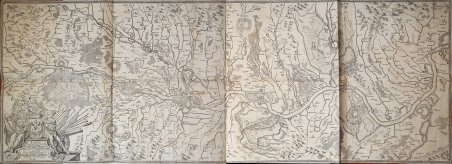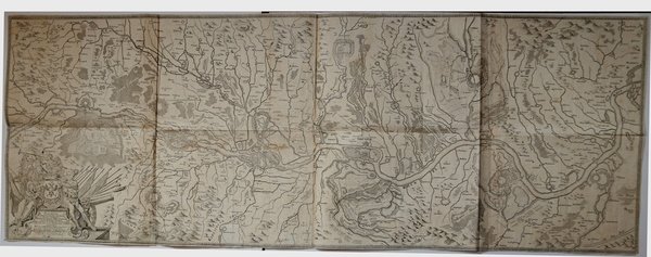 Karten Einiger an dem Ufer deß Rheins ligender Festungen : worbey die Kajserl. Bühler, Hagenauer und Weissenburger Linien, wie auch die Battaille bey Hünningen und lezte Glorieuse Belagerung Landau angezeigt / Alles mit sonderbahrem Fleiß gezeichnet von Johann Conrad Fuchs, Hochfürstl. Öttingischen Landts-Haubtmann.Grande mappa del corso del Reno, composta da due lastre incise in rame, edita da Jeremias Wolff di Augsburg, 1707.Monumentale carta dell' Alto Reno durante la guerra di successione spagnola, raffigurante il corso del fiume da Rheinfelden a Magonza. Römer la descrive: "La mappa di Johann Conrad Fuchs è caratterizzata dalla varietà di assedi, formazioni di battaglia, fortezze e linee difensive. Si vorrebbe dare una panoramica della situazione militare nell'alta valle del Reno nel 1707".Rara. Karten Einiger an dem Ufer deß Rheins ligender Festungen : worbey die Kajserl. Bühler, Hagenauer und Weissenburger Linien, wie auch die Battaille bey Hünningen und lezte Glorieuse Belagerung Landau angezeigt / Alles mit sonderbahrem Fleiß gezeichnet von Johann Conrad Fuchs, Hochfürstl. Öttingischen Landts-Haubtmann.Large map of the course of the Rhine, consisting of two copper engraved plates, published by Jeremias Wolff of Augsburg, 1707. Monumental map of 'Upper Rhine during the War of the Spanish Succession, depicting the river from Rheinfelden to Mainz. Römer describes it: "The map of Johann Conrad Fuchs is characterized by the variety of sieges, battle formations, fortresses and defensive lines. We would like to give an overview of the military situation in the upper valley of the Rhine in 1707." Rare. Cfr. Stopp-L. Go 4. Römer 29. Gier-J. 420.