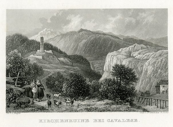 Incisione in acciaio di dimensioni 93x148 mm. Condizioni : USATO - Stato : Buono, ordinari segni d'uso e del tempo. Altre note : Veduta di ispirazione romantica raffigurante la zona di Cavalese. Le rovine che danno il titolo all'opera vennero lasciate a ricordo della sollevazione valligiana contro l'oppressione feudale occorsa nell'anno 1296. Il disegno è di Mayer, l'incisione di Grünewald e Cooke. Scheda bibliografica tratta da "Trento illustrata: la città e il territorio in piante e vedute dal XVI al XX secolo" di Aldo Chemelli e Carlo e Marcus Perini, scheda n. 161.