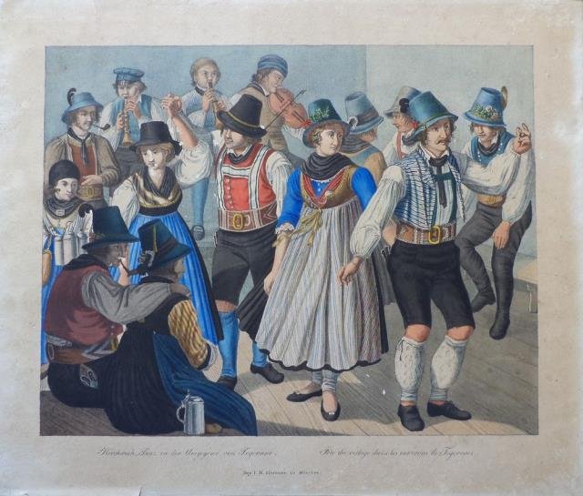 Munchen, 1830 circa. Litografia colorata a mano, cm 21,2 x 26,7 (la parte figurata) più margini. Tegernsee è un comune tedesco, situato in Baviera, sulle rive dell'omonimo lago; nel suo territorio si trova la celebre abbazia benedettina. Alcune piccole abrasioni della carta sul figurato, ingiallimento uniforme dei margini, peraltro in bella e vivace coloritura, grandi e belle le figure che danzano in primo piano. .
