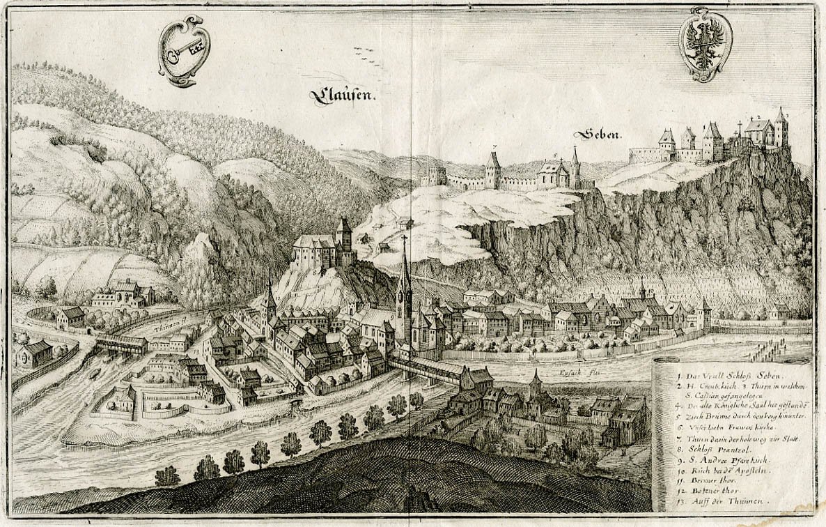 Acquaforte di dimensioni 190x305 mm. Condizioni : USATO - Stato : Buono, ordinari segni d'uso e del tempo. Gora d'acqua nell'angolo inferiore dx. Altre note : Veduta della cittadina di Chiusa, Klausen in lingua tedesca. Preciso nelle indicazioni dei luoghi, di cui abbiamo i rimandi nel cartiglio posto all'angolo inferiore destro, Merian ci mostra Chiusa nel suo svilupparsi tra il fiume Isarco nel primo piano e il torrente Thienne sulla sinistra. Distinguiamo le tre Torri: la torre Bolzano sulla sinistra, la torre Bressanone sulla destra e infine quella del Ponte. La scena è dominata sulla destra dall'antica abbazia di Sabiona. Scheda bibliografica tratta da "Il Trentino-Alto Adige: immagini dal passato" di Brunamaria Dal Lago Veneri e Arnaldo Loner , scheda n. 11.