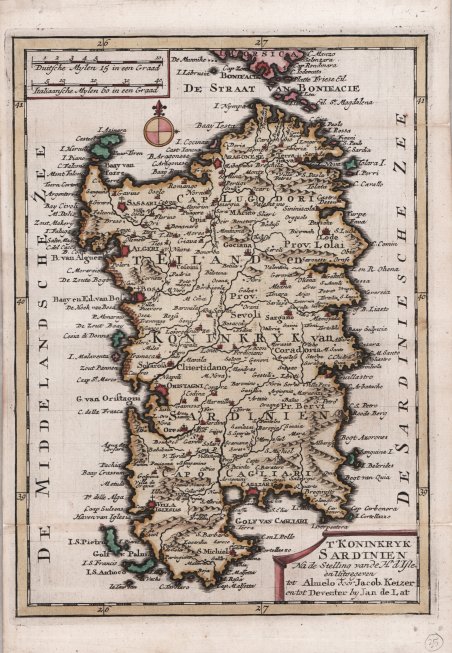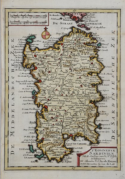 Carta geografica della Sardegna edita ad Amsterdam verso la metà del XVIII secolo. Incisione in rame, bella coloritura coeva, in ottimo stato di conservazione. Rara. Carta geografica della Sardegna edita ad Amsterdam verso la metà del XVIII secolo. Incisione in rame, bella coloritura coeva, in ottimo stato di conservazione. Rara. Cfr.