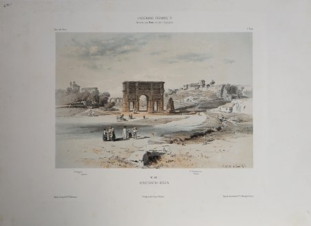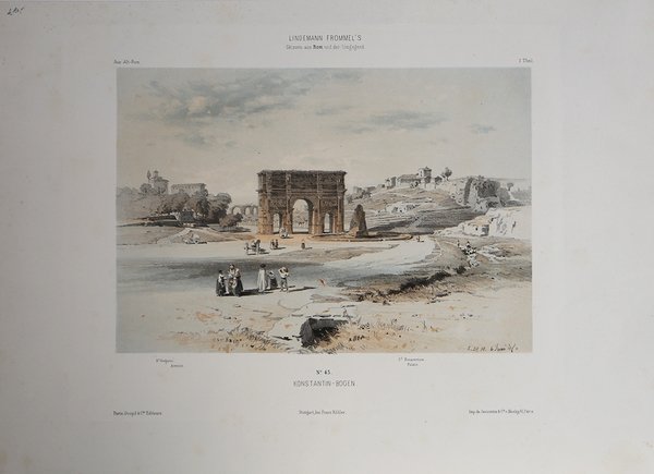 Veduta tratta dalla celebre raccolta ' Skizzen und Bilder aus Rom ' [--Neapel; --Florenz] ' und Umgegend. [Stuttgart: Köhler, 1851-1860., una suite di tavole litografiche, molto rara, realizzata tra il 1851 e il 1860. Brunet cita solo la parte relativa a Roma e dintorni, mentre le altre due parti gli sfuggono. Le bellissime litografie, alcune delle quali firmate in pietra e datate 1848, raffigurano vedute di Roma (48 tavole, come la collazione di Brunet), di Napoli (36 vedute) e di Firenze (6 vedute). Karl August Lindemann-Frommel è stato un pittore di paesaggi e litografo. Lindemann nacque in Alsazia come quarto figlio della coppia di coniugi Karl August Philipp Lindemann (1776-1828) e Catharina Philippina Frommel (1787-1841). Il padre, proprietario di una fabbrica, morì quando Lindemann aveva nove anni. La custodia fu affidata allo zio Carl Ludwig Frommel, professore di pittura e incisione a Karlsruhe e direttore delle Pinacoteche granducali. Lindemann imparò il mestiere di artista da Frommel, che in seguito lo adottò. Il suo secondo insegnante influente fu Carl Rottmann. Dal 1844 al 1849 Lindemann viaggiò attraverso l'Italia, che sarebbe poi diventata il suo paese d'adozione. A Roma divenne membro fondatore dell'Associazione degli artisti tedeschi nel 1845. Incontra Karl Christian Andreae, di quattro anni più giovane, e lo ispira a studiare i paesaggi italiani. In seguito ha vissuto a Monaco e a Parigi, dove ha approfondito la pittura a olio. Nel 1856 Karl Lindemann-Frommel si stabilì a Roma, dove fu nominato professore all'Accademia di San Luca. Visse e lavorò a Roma fino alla sua morte, avvenuta nel 1891. Il Meyers ' Konversations-Lexikon, 1908, descrive le sue opere grafiche: "Come frutto dei suoi studi [in Italia] pubblicò una serie di vedute di Roma, Napoli, Firenze ecc. in litografie parzialmente colorate (Lipsia, 1851), a cui seguirono nel 1858 fogli litografati con motivi delle Paludi Pontine e 24 fogli di vedute di Potsdam”. Litografia tinta, buono stato di conservazione. Bibliografia Brunet III, 1082; Lindemann-Frommel, Karl, in Hans Vollmer, ' Allgemeines Lexikon der Bildenden Künstler von der Antike bis zur Gegenwart. Begründet von Ulrich Thieme und Felix Becker. Band 23: Leitenstorfer–Mander. E. A. Seemann, Leipzig 1929, p. 240; Peter K. W. Freude: ' Karl Lindemann-Frommel. Ein Malerleben in Rom. 1997. View from the famous collection ' Skizzen und Bilder aus Rom [--Neapel; --Florenz] und Umgegend. ' [Stuttgart: Köhler, 1851-1860., a very rare suite of lithographic plates made between 1851 and 1860. Brunet mentions only the part relating to Rome and its surroundings, while the other two parts escape him. The beautiful lithographs, some of them signed in stone and dated 1848, depict views of Rome (48 plates, like Brunet's collation), Naples (36 views) and Florence (6 views). Karl August Lindemann-Frommel was a landscape painter and lithographer. Lindemann was born in Alsace as the fourth child of the married couple Karl August Philipp Lindemann (1776-1828) and Catharina Philippina Frommel (1787-1841). His father, a factory owner, died when Lindemann was nine years old. Custody was entrusted to his uncle Carl Ludwig Frommel, a professor of painting and printmaking in Karlsruhe and director of the Grand Ducal Picture Galleries. Lindemann learned the artist's trade from Frommel, who later adopted him. His second influential teacher was Carl Rottmann. From 1844 to 1849 Lindemann traveled through Italy, which would later become his adopted country. In Rome he became a founding member of the Association of German Artists in 1845. He met Karl Christian Andreae, four years his junior, and inspired him to study Italian landscapes. He later lived in Munich and Paris, where he delved into oil painting. In 1856 Karl Lindemann-Frommel settled in Rome, where he was appointed professor at the Accademia di San Luca. He lived and worked in Rome until his death in 1891. The Meyers Konversations-Lexikon, 1908, describes his graphic works: "As the fruit of his studies he published a series of views of Rome, Naples, Florence etc. in partially colored lithographs (Leipzig, 1851), which was followed in 1858 by lithographed sheets with motifs of the Pontine Marshes and 24 sheets of views of Potsdam." Tinted lithograph, good condition. Bibliografia Brunet III, 1082; Lindemann-Frommel, Karl, in Hans Vollmer, ' Allgemeines Lexikon der Bildenden Künstler von der Antike bis zur Gegenwart. Begründet von Ulrich Thieme und Felix Becker. Band 23: Leitenstorfer–Mander. E. A. Seemann, Leipzig 1929, p. 240; Peter K. W. Freude: ' Karl Lindemann-Frommel. Ein Malerleben in Rom. 1997. Cfr.