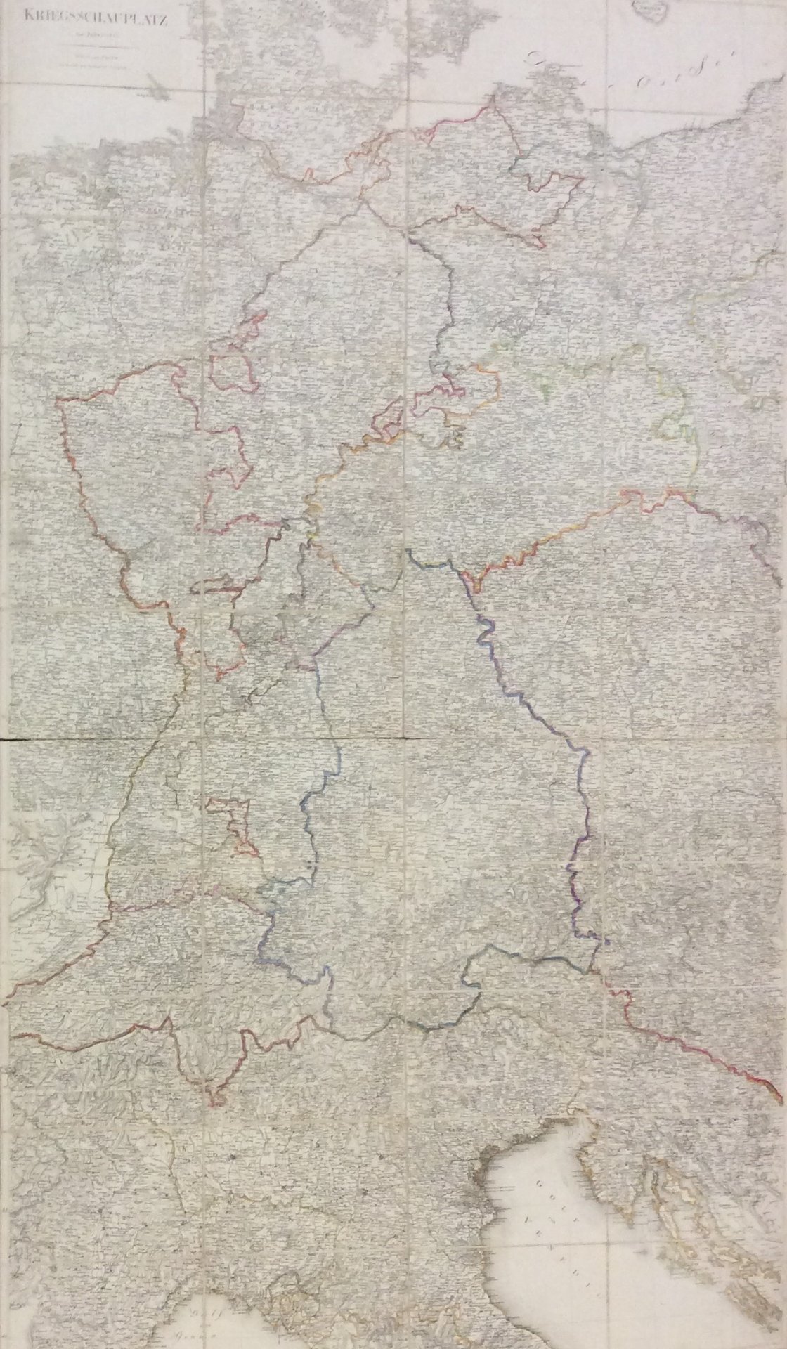 Grande carta geografica inc. in rame con i confini colorati a mano, montata su tela e suddivisa in 2 fogli - il 1° di cm. 73,3 x 78, suddiviso in 24 riquadri; il 2° di cm. 61,5 x 78, suddiviso in 20 riquadri. Vi è raffigurata l'Europa Centrale durante la guerra contro Napoleone nel 1813. La carta, molto ben conservata, è conservata in un astuccio con aletta e custodia in cartonato (cm. 20x13).