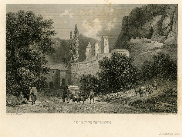 Incisione in acciaio di dimensioni 92x150 mm. Condizioni : USATO - Stato : Buono, ordinari segni d'uso e del tempo. Lievi bruniture. Altre note : Veduta del castello dei conti Firmian presso Mezzocorona, con animazione in primo piano e le rovine del castello di S. Gottardo nella caverna soprastante. In basso informazioni su stampatore, autore e sugli incisori Grünewald e Cooke. Sta in "Das Malerische und Romantische Deutschland". Scheda bibliografica tratta da "Trento illustrata: la città e il territorio in piante e vedute dal XVI al XX secolo" di Aldo Chemelli e Carlo e Marcus Perini, scheda n. 50.