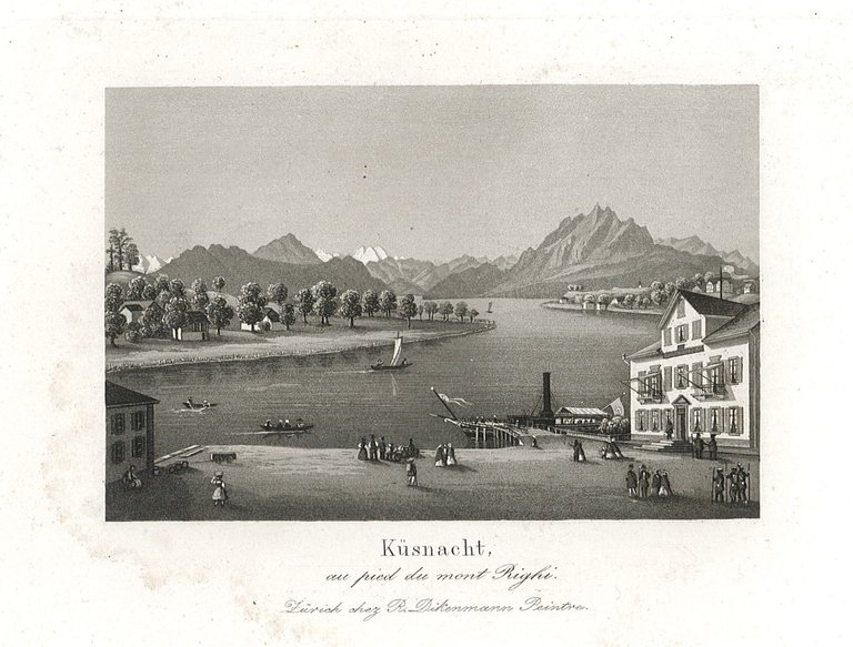 Stampa, antica ed originale, raffigurante il paese di Küsnacht in raffinata acquatinta. Inserita nell'opera "Souvenir de la Suisse" edita a Zurigo. Autore: Dikenmann Rudolf dis. (1793 Zürich 1883). Luogo: Küsnacht CH. Anno: 1860 ca. Tecnica: acquatinta. Dimensioni: 74x112 mm