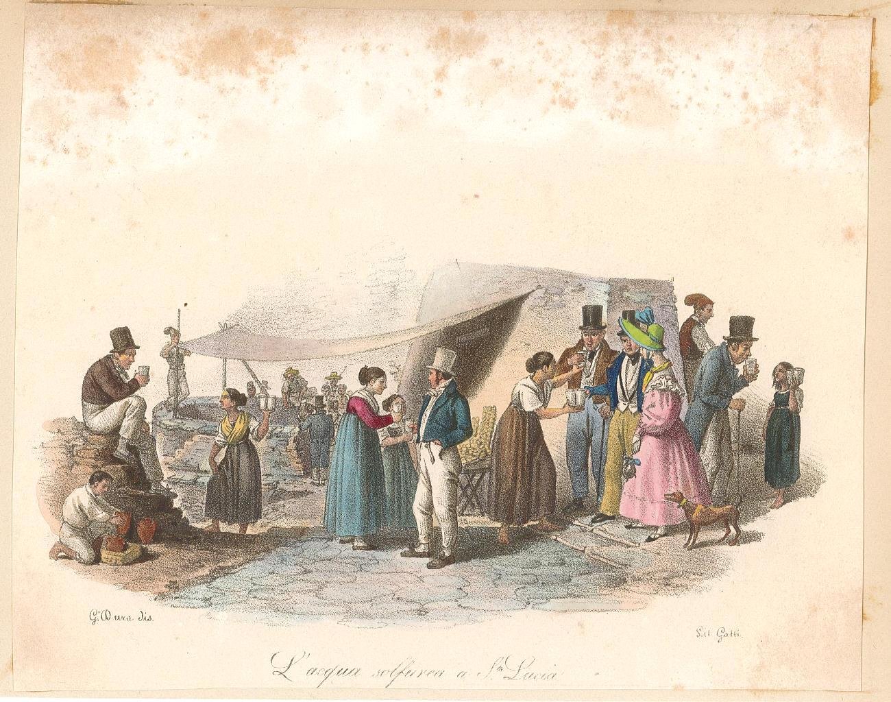 Litografia, antica originale, in bella coloritura coeva, raffigurante la vendita della famosa acqua presso la fonte di Santa Lucia. L'incisione è ridimensionata al margine ed applicata all'epoca su di un supporto cartaceo coevo