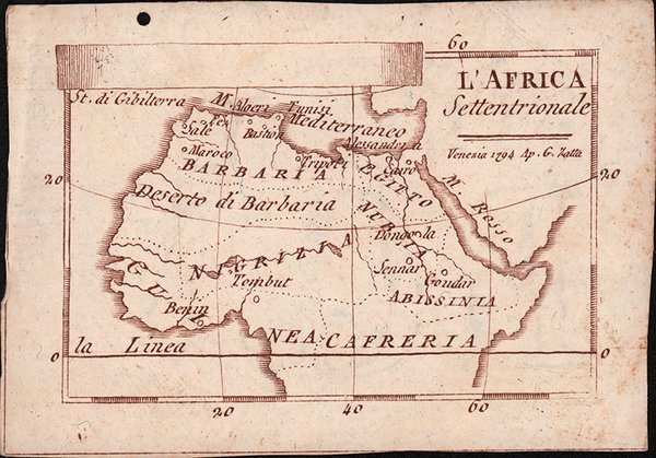 RARITA’ CARTOGRAFICA Sconosciuta piccola carta geografica con imprint di Giacomo Zatta e data 1794, appartenente a un non documentato atlante in miniatura dal titolo “Atlante tascabile per le dame”, suddiviso in tre tomi, stampati “IN VENETIA Presso G. Zatta”, senza data ma circa 1795. Si tratta di carte da visita – con un apposito spazio bianco dove apporre il proprio nome – dove compare l’imprint o di Pietro Zancon (accompagnato dalla data 1794) o di Giacomo Zatta (con data 1794 o 1795), che, come si legge sul frontespizio, risulta l’editore dell’opera. Possiamo ipotizzare che la serie, iniziata da Zancon fu poi terminata dallo Zatta. Sulla carta dell’Italia – presumibilmente la prima tavola dell’opera – compare stampato il nome di Chiara Minelli Rota, nobildonna veneziana che sposò Antonio Rota nel 1794; tutte le restanti 65 carte recano lo spazio bianco privo di nome. In precedenza, le carte erano note solo attraverso una serie, priva di imprint editoriale, venduta 21 anni fa (1999) dall’Antiquariaat Haas di Bedburg Hau; parlando con Stephan Haas, la serie, priva di titolo e dati editoriali si componeva di 70 mappe. Le carte furono vendute separatamente sotto il nome di G. Bonatti, firma dell’incisore che si trova nella carta della Francia. In seguito, le tavole furono attribuite a Pietro Zaricen da Geoffrey King (cfr. Miniature Antique Maps, p. 181). Il nome dello Zaricen viene dedotto dalla carta della contea del Roussillon, che reca l’iscrizione “Venezia 1794 App.o P. Zancon”, letto erroneamente come Zaricen. Lajos Szantai include la carta dell’Ungheria nella sua cartobibliografia, traducendo il nome dell’autore in Zancen (cfr. Atlas Hungaricus 1528-1850). Sempre King, che non menziona nessuna carta firmata da Zatta, sostiene che “About the turn of the century a signed card of the first edition, with a map of the province of Roussillon in the south of France, was seen at an Ephemera Society Fair in London”. Questo esemplare sembrerebbe oggi quello conservato alla Yale University Library [1978 351], che lo descrive composto da 70 carte geografiche. Non sappiamo se sia il numero totale delle mappe, e l’assenza di un indice o dell’elenco non consente di stabilire l’esatto numero delle carte che lo compongono. http://hdl.handle.net/10079/bibid/3611852Confrontando le carte erroneamente attribuite allo Zaricen ci si accorge che la lastra è abrasa in corrispondenza della firma di Zancon o Zatta. Molto scarse sono le notizie sulle carte che possiamo ora definire “ex Zaricen”. Jason Hubbard nella sua bibliografia recente sulle carte del Giappone raffigura la carta priva dell’imprint “App.o G. Zatta” attribuendola - sulla base delle informazioni bibliografiche finora note – a Giuseppe Bonatti e Pietro Zaricen: “This is one of the 70-odd geographical cards, printed on one side only, acquired by the Haas brothers in 1999. The cards cover countries around the world and include detailed map of Italian provinces. The card with the map of France carries the inscription: G. Bonatti fece; and it is presumed that Bonatti engraved all of them although this is questioned by King” (cfr. J. Hubbard, Japoniae Insulae, n. 124). Il nostro esemplare della carta della Francia, che reca l’imprint “Venezia 1794, App.o P. Zancon” reca in basso a destra la firma di Bonatti sopra menzionata. Dunque, l’unica differenza tra questa serie di sconosciute carte sembra essere la presenza degli imprint editoriali di Zancon e Zatta, accompagnati dalla data 1794 o 1795. Giuseppe Bonatti è menzionato da V. Valerio nella qualità di incisore cresciuto alla scuola Remondini di Bassano, autore di alcune carte per l’atlante di Pazzini Carli (Siena, 1788-1800) e per l’Atlante Geografico di Carlo Antonio Barbiellini (Milano, 1807). Dal 1809 in poi lavorò come incisore per il Deposito della Guerra di Milano (cfr. V. Valerio, Cartografi Veneti, p. 153). Pietro Zancon era, assieme . A GREAT RARITY Unknown small map with imprint by Giacomo Zatta and date 1794, belonging to an undocumented miniature atlas entitled “Atlante tascabile per le dame” (Pocket Atlas for ladies), divided into three volumes, printed "IN VENETIA Presso G. Zatta", undated but about 1795. A rare set of visiting cards published in Italy features pretty little maps of all parts of the world - with a special white space where to put your name - where the imprint appears or of Pietro Zancon (accompanied by the date 1794) or Giacomo Zatta (with the date 1794 or 1795), who, as can be read on the title page, is the publisher of the whole Atlas. We can speculate that the series, started by Zancon was later terminated by Zatta. On the map of Italy is printed - presumably the first map of the work - the name of Chiara Minelli Rota, Venetian noblewoman who married Antonio Rota in 1794; all remaining 65 maps bear the blank space without names. Previously, the maps were known only through a series, without editorial imprint, sold 21 years ago (1999) by the Antiquariaat Haas of Bedburg Hau; speaking with Stephan Haas, the series, without title and printing details, consisted of 70 maps. The maps were sold separately under the name of G. Bonatti, the engraver's signature found on the map of France. Later, the plates were attributed to Pietro Zaricen by Geoffrey King (see Miniature Antique Maps, p. 181). The name of Zaricen is derived from the Roussillon county map, which bears the inscription "Venice 1794 App.o P. Zancon", incorrectly read as Zaricen. Lajos Szantai includes the map of Hungary in his cartobibliography, translating the author's name into Zancen (see Atlas Hungaricus 1528-1850). Always King, who does not mention any map signed by Zatta, said: "About the turn of the century a signed card of the first edition, with a map of the province of Roussillon in the south of France, was seen at an Ephemera Society Fair in London ". This copy would seem to be the one preserved in the Yale 