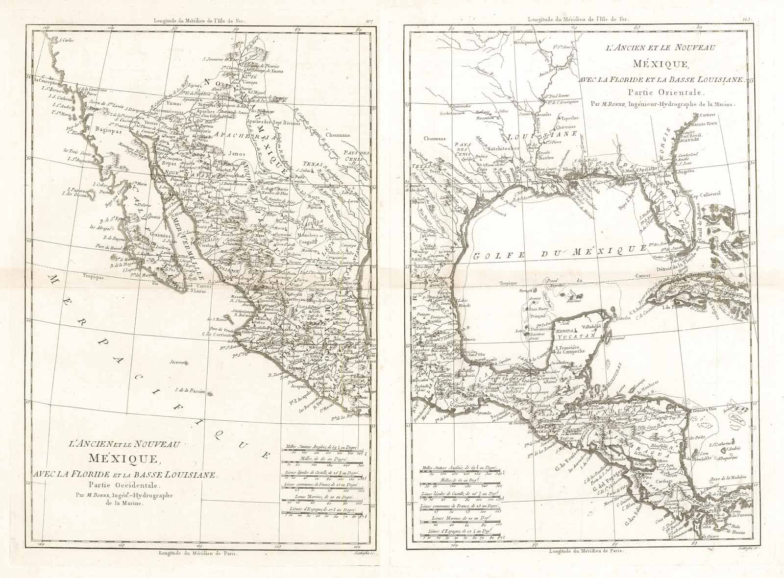 Carta geografica, in due fogli, raffigurante i territori di California, Messico, Texas, Luisiana e Florida. Rigobert Bonne (1727-1795) fu uno dei più importanti cartografi del tardo XVIII secolo. Nel 1773 succedette a Jacques Bellin come cartografo reale in Francia.