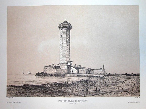 L'ANCIEN PHARE DE LIVORNO (dit le Marzocco). Riproduzione tratta dall'album "La Toscane" di André Durand.