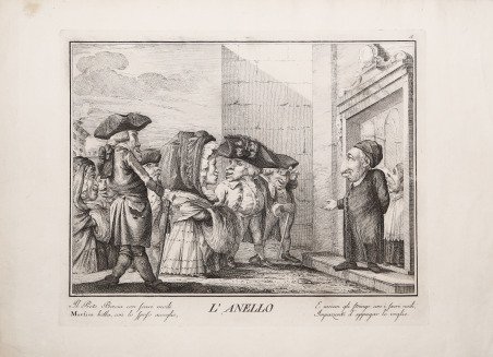 Acquaforte, 1791/95, firmata in basso a sinistra ' C. Lasinio f. Da un soggetto di Giuseppe Piattoli. Bellissima prova, impressa su carta coeva, con margini, in ottimo stato di conservazione. Tavola della serie ' Lo Sposalizio di Marfisa, una serie di 10 opere incise da Carlo Lasinio su disegno di Giuseppe Piattoli e pubblicate a Firenze dalla tipografia di Niccolò Pagni e Giuseppe Bardi. Per la datazione delle stampe, sia Lazzaro che Scrase - analizzando gli esemplari conservati al Cantor Arts Center - propongono il 1790 basandosi, forse, sulla data della tavola intitolata “La buona notte”, l’unica in cui l’ultima cifra sembra essere uno zero. Tuttavia, l’assenza della serie di Marfisa nell’elenco delle opere in vendita in un altro ' Catalogo delle stampe incise in rame che si vendono in Firenze da Niccolò Pagni, e Giuseppe Bardi ' stampato a Firenze dopo il 1791, avvalora l’ipotesi di una datazione seguente a questa data poiché risulterebbe inconsueta la mancata promozione di una raccolta edita soltanto l’anno precedente. In un successivo catalogo della tipografia conservato nella Raccolta Bertarelli, troviamo citato “Lo sposalizio di Marfisa, o sia raccolta di Caricature diverse inventate da Giuseppe Piattoli in Num. 10 mezzi fogli imperiali, ed espresse a colori. Paoli 15”. Le dieci incisioni - mai rilegate e prive di frontespizio - accompagnate da iscrizioni di titolazione e documentarie, costituiscono un vero e proprio poemetto figurato con i momenti chiave che preludono a un matrimonio alla moda settecentesca, i cui eleganti versi stridono, volutamente, con i personaggi grotteschi ai quali si riferiscono, accentuandone il carattere ridicolo. La vasta letteratura satirica e burlesca di tradizione toscana, insieme alle poesie e canzoni popolari, ispirano certamente il Piattoli, al quale doveva essere nota la produzione del poeta Francesco Berni, vissuto due secoli prima, dal quale deriva il termine “bernesco” per definire un vero e proprio genere letterario, che ebbe numerosi imitatori e influenzerà anche la pittura caricaturale a cavallo tra Sei e Settecento. Altra fonte di ispirazione, fu il poema eroicomico, intitolato ' La Marfisa Bizzarra, composto da Carlo Gozzi tra il 1761 e il 1768, il quale offre al pubblico una stravagante versione del mondo epico-cavalleresco. Per quanto riguarda, invece, le fonti grafiche e pittoriche utilizzate dall’artista se ne possono suggerire molteplici e di diversa provenienza: quella anglosassone - soprattutto la famosa serie realizzata da William Hogarth, tra il 1743 e il 1745, dal titolo ' Mariage à la mode; quella veneta - motivi satirici e scherzosi del costume veneziano caratterizzano le incisioni di Giandomenico Tiepolo, che ritraggono scene di vita quotidiana; quella romana, dove l’abbondante produzione caricaturale di Pier Leone Ghezzi era all’epoca tra le più diffuse, e non ultima la tradizione toscana, i cui personaggi deformi saranno tra i soggetti preferiti della pittura di genere dal Cinquecento al Settecento. Sarà però l’incisore lorenese Jacques Callot, arrivato nel 1611 a Firenze, a creare con i suoi ‘Gobbi’ una tipologia caricaturale che influenzerà non solo le opere di artisti a lui coevi come Stefano Della Bella e Baccio del Bianco, ma anche quelle del bresciano Faustino Bocchi e di Giovanni Domenico Ferretti, rievocanti in alcuni tratti le affascinanti grottesche di Gaetano Piccini, i cui personaggi - i cosiddetti caramogi - sono gli stessi che popolano ' Lo Sposalizio di Marfisa. Piattoli attinge, dunque, a piene mani da questi repertori traendo ispirazione soprattutto dai disegni di Baccio, nonostante siano tra quelli meno conosciuti poiché non tradotti in incisione. Per il Piattoli le ‘Nozze di Marfisa’ non sono altro che il pretesto per deridere benevolmente l’ingenuo e coinvolgente sentimento amoroso della fanciulla desiderosa di percorrere tutte le fasi convenzionali che preludono al matrimonio, a comin. Etching, 1791/95, signed at lower left C. Lasinio f. From a subject by Giuseppe Piattoli. Beautiful proof, impressed on contemporary wove paper, with margins, in excellent condition. Plate from the series ' Lo Sposalizio di Marfisa, a series of 10 works engraved by Carlo Lasinio from a drawing by Giuseppe Piattoli and published in Florence by the printing house of Niccolò Pagni and Giuseppe Bardi. For the dating of the prints, both Lazarus and Scrase -analyzing the examples preserved at the Cantor Arts Center - propose 1790 based, perhaps, on the date of the panel titled "La buona notte," the only one in which the last figure appears to be a zero. However, the absence of the Marfisa series in the list of works for sale in another ' Catalogo delle stampe incise in copperplate che si vendono in Firenze da Niccolò Pagni, e Giuseppe Bardi ' printed in Florence after 1791, supports the hypothesis of a dating after this date since it would be unusual for a collection published only the previous year not to be promoted. ' In a later catalog of the printer preserved in the Bertarelli Collection, we find the series listed as "Lo sposalizio di Marfisa, o sia raccolta di Caricature diverse inventate da Giuseppe Piattoli in Num. 10 mezzo fogli imperiali, ed espresse a colori. ' 15 Pauls." The ten engravings, lacking a frontispiece, constitute a veritable figurative poem with the key moments that prelude an eighteenth-century fashionable wedding, whose elegant verses deliberately clash with the grotesque characters to whom they refer, accentuating their ridiculous character. The vast satirical and burlesque literature of the Tuscan tradition, together with popular poems and songs, certainly inspired Piattoli, to whom the production of the poet Francesco Berni, who had lived two centuries earlier, must have been familiar, from whom the term "bernesco" was derived to define a true literary genre, which had numerous imitators and would also influence caricature painting at the turn o