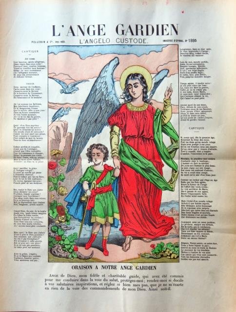 Pellerin & C. Imp. - Édit., Imagerie d'Epinal, 1895. Incisione su legno in colore d'epoca, cm 30 x 39 circa (il foglio). Avec une “Oraison a notre Ange Gardien” ai lati dell’immagine. Molto buono. .