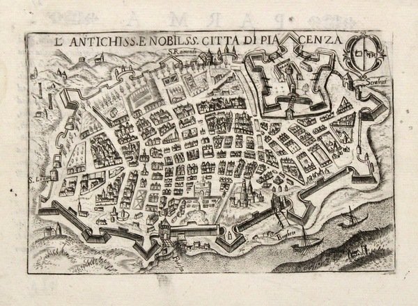 Incisione in rame, mm 120x175. Tratta da "Teatro delle Città d'Italia". Buon esemplare con alone di umidità al margine sinistro.