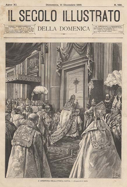 Veduta interna: il Papa Leone XIII si appresta ad aprire la Porta Santa per il Giubileo, nella basilica di San Pietro. Testo al retro