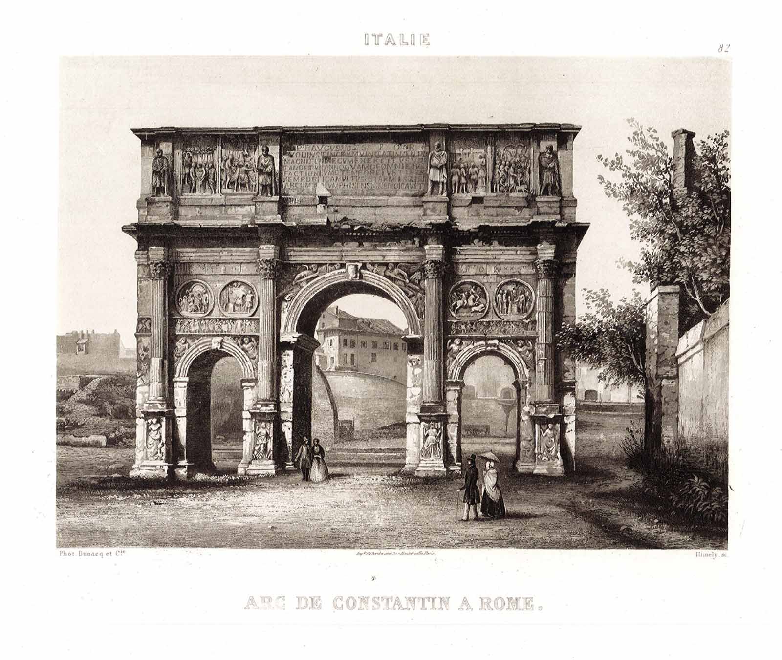 Stampa, antica ed originale, con veduta dell'Arco di Costantino. Inserita nell'opera "Excursions photographiques. Vues et monuments les plus remarquables de l'univers.". Parigi 1863. Autore: Himely sculp. Luogo: Roma. Anno: 1863. Tecnica: acquatinta. Dimensioni: 270x370 il foglio.