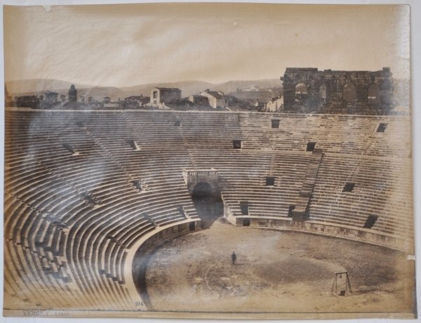 Fotografia all'albumina di mm 260 x 202. Buono stato di conservazione. In basso la dicitura "Verona Arena" e dentro la fotografia in nero "104". Lo stabilimento fotografico di Giacomo Brogi (1822-1881) venne fondato a Firenze nel 1864, e proseguì la sua attività, sotto la direzione del figlio Carlo, fino al 1950, rappresentando con le loro immagini un secolo di storia italiana.