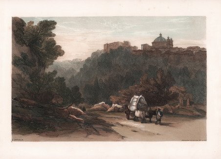 Veduta della città tratta da ' Views of Rome and its Environs ' pubblicato a Londra da Thomas M'Lean nel 1841. Lear fu infaticabile e coraggioso viaggiatore, eseguì schizzi prima in Europa nel Mediterraneo poi in Egitto e nel Medio Oriente. Egli voleva, come si espresse, “topographise all the journeyngs of my life”. Per citare sommariamente, pubblicò ' Views of Rome and its Environs ' nel 1841, due serie di ' Illustrated Excursions in Italy, Journal of a Landscape Painter in Southern Calabria, Views in seven Ionian Islands ' e ' Journal of Landscape Painter ' in Corsica ' nel 1870. Il ' Views of Rome and its Environs ' è il primo dei suoi libri di viaggio. A partire dal 1837 Lear trascorse diversi inverni in Italia. "Views of Rome" registra le sue prime impressioni sulla terra che sarebbe diventata una seconda casa per lui. In queste litografie panoramiche è più interessato al drammatico scenario intorno a Roma che alla Città Santa stessa; senza dubbio le sue stampe topografiche di maggior successo. Litografia tinta, in ottimo stato di conservazione. Bibliografia Ray 91; Abbey Travel 183. View of the city, taken from ' Views of Rome and its Environs, published to London by Thomas M’Lean, 1841. Lear was an indefatigable and courageous traveller and sketched first in Europe in the Mediterranean and then in Egypt and the Middle East. He wanted to, as he put it, “topographise all the journeyngs of my life”. To mention only a few, he published ' Views of Rome and its Environs ' in 1841, two series of ' Illustrated Excursions in Italy, Journal of a Landscape Painter in Southern Calabria, ' Views in seven Ionian Islands ' and finally ' Journal of Landscape Painter in Corsica ' in 1870. The first of Lear’s travel books. Beginning in 1837 Lear spent several winters in Italy. “Views of Rome” records his first impressions of the land that was to become a second home to him. In these panoramic lithographs he is more concerned with the dramatic scenery around Rome than with the Holy City itself. Their freshness and size combine to make them his most successful topographical prints. Tinted lithograph, very good condition. Literature Ray 91; Abbey Travel 183. Cfr.