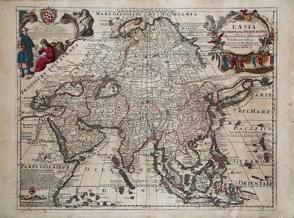 Rarissima carta geografica del continente asiatico derivante da quella di Nicolas de Fer, edita a Parigi verso la fine del XVII secolo. La mappa è tratta dal ' Atlante Partenopeo ' dell'editore e libraio napoletano Paolo Petrini. L'atlante è una complessa operazione editoriale messa in atto da Petrini per raccogliere molte della carte da lui realizzate a partire dall'ultimo decennio del XVII secolo, tratte sostanzialmente da Guillaulme Sanson, Nicolas De Fer e Giacomo Cantelli, e pubblicate con aggiornamenti ancora per gran parte del'700 dal figlio Nicola. L'atlante del Petrini rappresentava per il Regno di Napoli, l'equivalente del ' Mercurio Geografico ' stampato a Roma dalla tipografia De Rossi, e circolante principalmente nello Stato Pontificio. Incisione in rame, coloritura coeva con ritocchi, in eccellente stato di conservazione. Very rare map of the Asian continent derived from that of Nicolas de Fer, published in Paris in the late 17th century. The map is taken from the Atlante Partenopeo by Neapolitan publisher and bookseller Paolo Petrini. The atlas is a complex publishing operation put in place by Petrini to collect many of the maps he produced beginning in the last decade of the 17th century, taken substantially from Guillaulme Sanson, Nicolas De Fer, and Giacomo Cantelli, and published with updates still through much of the 1700s by his son Nicola. Petrini's atlas represented for the Kingdom of Naples, the equivalent of the Mercurio Geografico printed in Rome by the De Rossi printing house, and circulated mainly in the Papal States. Copperplate engraving, coeval coloring with retouches, in excellent condition. Cfr.