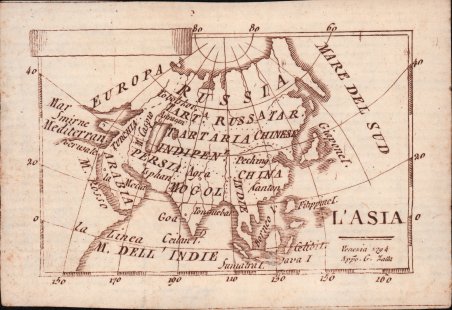 RARITA’ CARTOGRAFICA Sconosciuta piccola carta geografica con imprint di Giacomo Zatta e data 1794, appartenente a un non documentato atlante in miniatura dal titolo “Atlante tascabile per le dame”, suddiviso in tre tomi, stampati “IN VENETIA Presso G. Zatta”, senza data ma circa 1795. Si tratta di carte da visita – con un apposito spazio bianco dove apporre il proprio nome – dove compare l’imprint o di Pietro Zancon (accompagnato dalla data 1794) o di Giacomo Zatta (con data 1794 o 1795), che, come si legge sul frontespizio, risulta l’editore dell’opera. Possiamo ipotizzare che la serie, iniziata da Zancon fu poi terminata dallo Zatta. Sulla carta dell’Italia – presumibilmente la prima tavola dell’opera – compare stampato il nome di Chiara Minelli Rota, nobildonna veneziana che sposò Antonio Rota nel 1794; tutte le restanti 65 carte recano lo spazio bianco privo di nome. In precedenza, le carte erano note solo attraverso una serie, priva di imprint editoriale, venduta 21 anni fa (1999) dall’Antiquariaat Haas di Bedburg Hau; parlando con Stephan Haas, la serie, priva di titolo e dati editoriali si componeva di 70 mappe. Le carte furono vendute separatamente sotto il nome di G. Bonatti, firma dell’incisore che si trova nella carta della Francia. In seguito, le tavole furono attribuite a Pietro Zaricen da Geoffrey King (cfr. Miniature Antique Maps, p. 181). Il nome dello Zaricen viene dedotto dalla carta della contea del Roussillon, che reca l’iscrizione “Venezia 1794 App.o P. Zancon”, letto erroneamente come Zaricen. Lajos Szantai include la carta dell’Ungheria nella sua cartobibliografia, traducendo il nome dell’autore in Zancen (cfr. Atlas Hungaricus 1528-1850). Sempre King, che non menziona nessuna carta firmata da Zatta, sostiene che “About the turn of the century a signed card of the first edition, with a map of the province of Roussillon in the south of France, was seen at an Ephemera Society Fair in London”. Questo esemplare sembrerebbe oggi quello conservato alla Yale University Library [1978 351], che lo descrive composto da 70 carte geografiche. Non sappiamo se sia il numero totale delle mappe, e l’assenza di un indice o dell’elenco non consente di stabilire l’esatto numero delle carte che lo compongono. http://hdl.handle.net/10079/bibid/3611852Confrontando le carte erroneamente attribuite allo Zaricen ci si accorge che la lastra è abrasa in corrispondenza della firma di Zancon o Zatta. Molto scarse sono le notizie sulle carte che possiamo ora definire “ex Zaricen”. Jason Hubbard nella sua bibliografia recente sulle carte del Giappone raffigura la carta priva dell’imprint “App.o G. Zatta” attribuendola - sulla base delle informazioni bibliografiche finora note – a Giuseppe Bonatti e Pietro Zaricen: “This is one of the 70-odd geographical cards, printed on one side only, acquired by the Haas brothers in 1999. The cards cover countries around the world and include detailed map of Italian provinces. The card with the map of France carries the inscription: G. Bonatti fece; and it is presumed that Bonatti engraved all of them although this is questioned by King” (cfr. J. Hubbard, Japoniae Insulae, n. 124). Il nostro esemplare della carta della Francia, che reca l’imprint “Venezia 1794, App.o P. Zancon” reca in basso a destra la firma di Bonatti sopra menzionata. Dunque, l’unica differenza tra questa serie di sconosciute carte sembra essere la presenza degli imprint editoriali di Zancon e Zatta, accompagnati dalla data 1794 o 1795. Giuseppe Bonatti è menzionato da V. Valerio nella qualità di incisore cresciuto alla scuola Remondini di Bassano, autore di alcune carte per l’atlante di Pazzini Carli (Siena, 1788-1800) e per l’Atlante Geografico di Carlo Antonio Barbiellini (Milano, 1807). Dal 1809 in poi lavorò come incisore per il Deposito della Guerra di Milano (cfr. V. Valerio, Cartografi Veneti, p. 153). Pietro Zancon era, assieme . A GREAT RARITY Unknown small map with imprint by Giacomo Zatta and date 1794, belonging to an undocumented miniature atlas entitled “Atlante tascabile per le dame” (Pocket Atlas for ladies), divided into three volumes, printed "IN VENETIA Presso G. Zatta", undated but about 1795. A rare set of visiting cards published in Italy features pretty little maps of all parts of the world - with a special white space where to put your name - where the imprint appears or of Pietro Zancon (accompanied by the date 1794) or Giacomo Zatta (with the date 1794 or 1795), who, as can be read on the title page, is the publisher of the whole Atlas. We can speculate that the series, started by Zancon was later terminated by Zatta. On the map of Italy is printed - presumably the first map of the work - the name of Chiara Minelli Rota, Venetian noblewoman who married Antonio Rota in 1794; all remaining 65 maps bear the blank space without names. Previously, the maps were known only through a series, without editorial imprint, sold 21 years ago (1999) by the Antiquariaat Haas of Bedburg Hau; speaking with Stephan Haas, the series, without title and printing details, consisted of 70 maps. The maps were sold separately under the name of G. Bonatti, the engraver's signature found on the map of France. Later, the plates were attributed to Pietro Zaricen by Geoffrey King (see Miniature Antique Maps, p. 181). The name of Zaricen is derived from the Roussillon county map, which bears the inscription "Venice 1794 App.o P. Zancon", incorrectly read as Zaricen. Lajos Szantai includes the map of Hungary in his cartobibliography, translating the author's name into Zancen (see Atlas Hungaricus 1528-1850). Always King, who does not mention any map signed by Zatta, said: "About the turn of the century a signed card of the first edition, with a map of the province of Roussillon in the south of France, was seen at an Ephemera Society Fair in London ". This copy would seem to be the one preserved in the Yale 