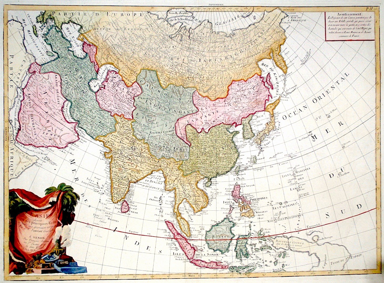 Incisione in rame, colorata a mano, 482x660. Edizione veneziana della carta di Janvier, tratta da "Atlas Universel" stampato a Venezia fra il 1776 ed il 1784. Esemplare molto bello.<BR><BR>