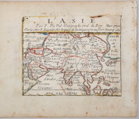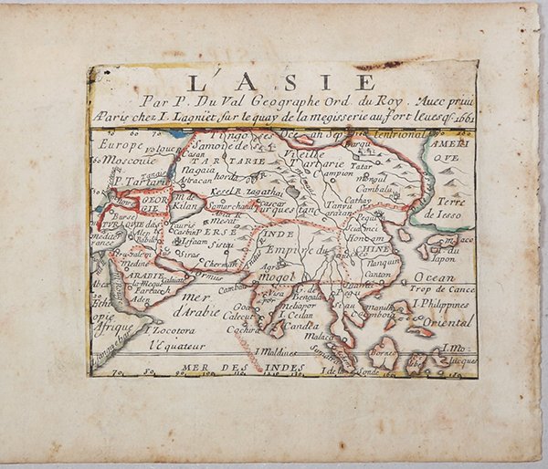 Acquaforte, 1656 circa, con coloritura coeva dei contorni, in buone condizioni.Esemplare del secondo stato di due, con l’imprint di Jacques Lagniet e la data del 1661.La mappa proviene dal rarissimo foglio intitolato “L’Asie par P. Du Val Geographe du Roy”, dal quale è stato ritagliato all’epoca - come anche certificato dalle antiche iscrizioni a inchiostro su alcune delle mappe - venendo applicato su un supporto di carta contemporanea, a formare un piccolo atlante in-sedicesimo oblungo.Secondo Philip Burden, lo scopo di questa rara curiosità cartografica di Pierre Duval non è noto. Fa parte di un insieme di quattro tavole raffiguranti i continenti. Può essere datato, per motivi cartografici, all’incirca nel 1656.La mappa dell’Asia è stata recentemente descritta da Jason Hubbard: “This miniature map of Japan is on a sheet of maps of Asia. Besides the map of the Asian continent there are 17 detailed maps including Turkey, the Holy Land, Georgia and Arabia. […] This map was issued as a loose sheet of Asia maps; similar maps are known for Africa, America and Europe” (cfr. Japoniae Insulae, The Mapping of Japan, p. 201).Richard Betz descrive 3 stati del foglio dell’Africa: senza la data, con l’imprint di Jacques Lagniet e la data del 1661, e con tracce di cancellazione sul suo indirizzo; secondo Hubbard il terzo stato della mappa dell'Asia può essere solo congetturato.È nota solo una copia del primo stato del foglio dell’Asia, venduta alla Old World Auctions (vendita n. 137, 14 settembre 2011) mentre sono conosciuti 5 esemplari del secondo stato (due alla Bibliotheque National de France, Bedburg-Hau Antiquariat Haas, e in due collezioni private a Kyoto e Londra). Etching, circa 1656, with contemporary outline colour, good condition.Example of the second state, with the imprint of Jacques Lagniet and the date 1661.The map comes from the very rare sheet entitled “L’Asie Par le Sieur Du Val Geographe Ord. du Roy”, from which it was cut at the time and laid down on contemporary laid paper support, to form a small atlas, as certified by the ancient ink inscriptions on some of the maps.According with Philip Burden “The purpose of this rare curiosity by Pierre Duval is not known. It forms part of a set of the four known continents. It can be dated to apporximately 1656 […] The second state bears the additional imprint of Jacques Lagniet and the date 1661” (cf. Burden, The Mapping of North America, pp. 417-418, n. 322). The map of Asia is recently described by Jason Hubbard: “This miniature map of Japan is on a sheet of maps of Asia. Besides the map of the Asian continent there are 17 detailed maps including Turkey, the Holy Land, Georgia and Arabia. […] This map was issued as a loose sheet of Asia maps; similar maps are known for Africa, America and Europe” (cf. Japoniae Insulae, The Mapping of Japan, p. 201).Richard Betz describes 3 states of this broadsheet: without the date, with the imprint of Jacques Lagniet and the date 1661, and with traces of erasure on his address, but according Hubbard the third state of the map of Asia is only an assumption.Only one copy of the first state of state of the broadsheet is known, sold at the Old World Auctions (sale #137, september 14, 2011) while 5 copies of the second state are known (two at the Bibliotheque National de France, Bedburg-Hau Antiquariat Haas, private collections in Kyoto and London). Cfr. J. Hubbard, Japoniae Insulae. The Mapping of Japan, pp. 199-201, n. 28; cf. Burden, The Mapping of America, n. 322, II/II; cf. Pastoureau (1984) p. 136; cf. Betz, The Mapping of Africa, pp. 294, 295, n. 85.