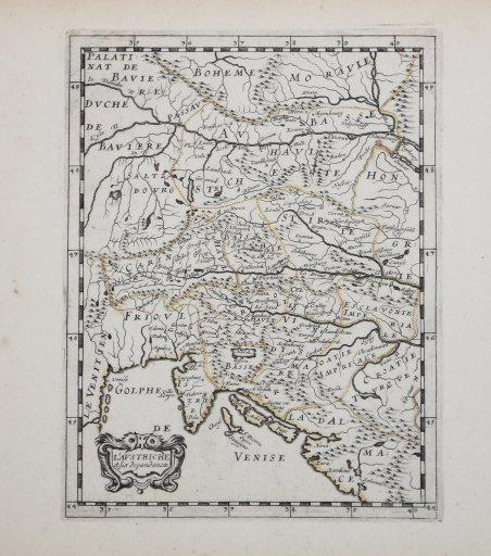 Carta geografica tratta dal "Theatre geographique de l'Europe, contenant la division de ses royaumes et provinces. Le tout suivant la table contenue au fueillet suivant par le P. Ph. Briet, de la Compagnie de Iesus", pubblicato a Parigi "chez Pierre Mariette, rue Saint Iacques, à l'Esperance M.DC.LIII". Si tratta di una rara opera del padre gesuita, nella quale si evidenzia il contributo delle missioni gesuitiche alle scoperte geografiche.Incisione in rame, in buono stato di conservazione.Biblografia: Mireille Pastoureau, "Les Atlas français (XVIe-XVIIe siècles) : Répertoire bibliographique et étude", Paris, 1984. Map taken from "Theatre Geographique de l'Europe.", a very rare work by the jesuit priest Briet, published in Paris by Pierre Mariette. Copperplate with original outline colour, in very good conditions. Cfr.