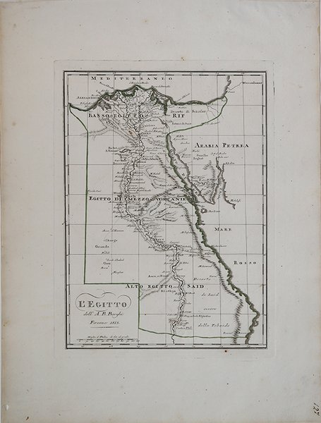 Carta geografica tratta dal raro "Atlante Geografico" dell'abate Bartolomeo Borghi (1750-1821), cartografo, incisore ed editore che tra l'altro pubblicò l'atlante del Pazzini Carli in Siena. Incisione in rame, coloritura coeva dei contorni, in ottimo stato di conservazione. A rare map from "Atlante Geografico" of priest Bartolomeo Borghi. Copperplate with original outline colour, in very good condition. Bartolomeo Borghi(1750-1821) was an italian cartographer, engraver and publisher (editor of Atlante Geografico by Pazzini Carli, Siena 1788/1800). Cfr.
