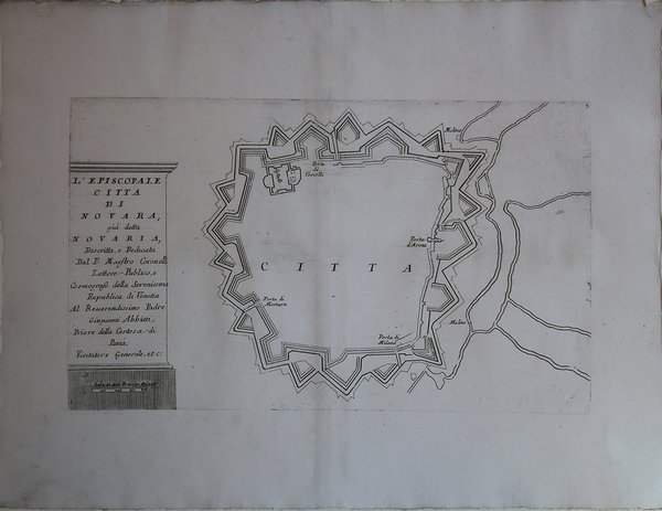 PRIMA EDIZIONE Esemplare tratto dal rarissimo ' Citta, Fortezze e, Isole, e Porti principali dell'Europa in Pianta et in Elevatione, Descritte, e Publicate Ad uso dell'Accademia Cosmografica degli Argonauti dal Padre Maestro Coronelli Lettore, e Cosmografo della Serenissima Republica di Venezia, edito a Venezia da Domenico Padovani nel 1689. Coronelli visse un periodo di straordinaria fecondità editoriale a partire dal 1689, quando ebbe la cattedra di geografia presso l'Università alle Procuratie, con la pubblicazione, nel 1690, del primo volume dell'Atlante Veneto. In effetti sotto il nome di ' Atlante Veneto ' va tutta la raccolta di tredici opere composte nell'arco del decennio successivo, dall'Isolario ' allo ' Specchio del mare. In realtà solo alcune di tali opere possono definirsi atlante, mentre altre, sono opere di compilazione o semplici raccolte di vedute e fortificazioni come questa rara raccolta. Incisione in rame, magnifica prova, con pieni margini, in perfetto stato di conservazione. FIRTS ISSUE This example of the map is taken from the very rare Coronelli's ' Citta, Fortezze e, Isole, e Porti principali dell'Europa in Pianta et in Elevatione, Descritte, e Publicate Ad uso dell'Accademia Cosmografica degli Argonauti dal Padre Maestro Coronelli Lettore, e Cosmografo della Serenissima Republica di Venezia, printed in Venice by Domenico Padovani in 1689. Coronelli lived a period of extraordinary editorial fecundity starting from 1689, when he had the chair of geography at the University at the Procuratie, with the publication, in 1690, of the first volume of the ' Atlante Veneto. Under the name of ' Atlante Veneto ' goes the entire collection of thirteen works composed over the next decade, from the ' Isolario ' to the ' Specchio del mare. Copperplate, with full margins, very good condition. Very rare. Cfr.