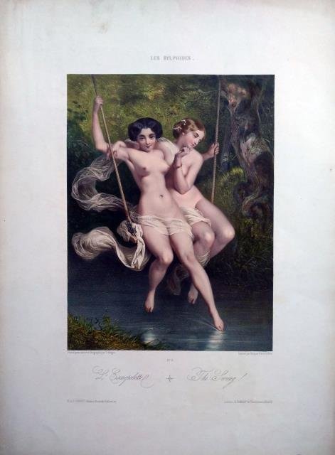 Imprimé par Bequet frères à Paris, 1880 circa. Litografia in coeva coloritura a mano (N. 11 - Peint d'après nature et lithographié par C. Bargue - Imprimé par Bequet frères à Paris), cm 40 x 55,5 (il foglio). Bella scena con due fanciulle su un'altalena avvolte soltanto da un velo che copre le parti intime, in un contesto di bosco, sopra uno stagno. Esemplare in piacevole coloritura e in buono stato di conservazione.