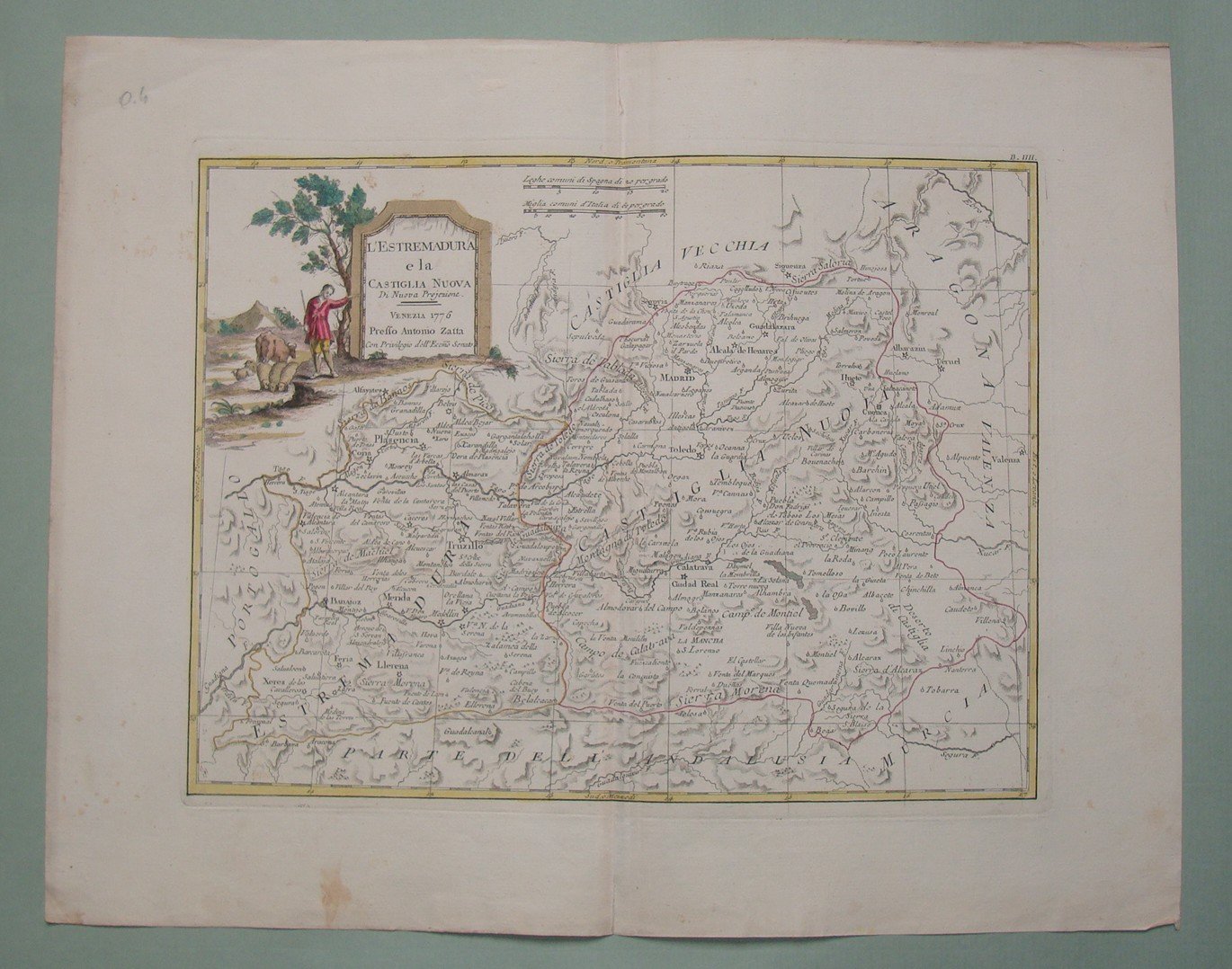 ZATTA Antonio. L'Estremadura e la Castiglia Nuova. Venice, 1776. Double page engraved map by Zatta. Cartouche. Contemp. hand coloured in outline. Cm.30x39.