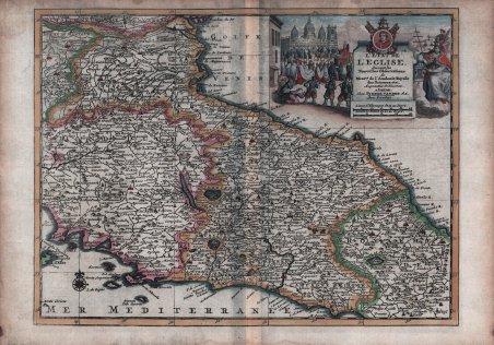 Decorativa carta geografica dell'Italia Centrale, pubblicata per la prima volta nel 1713 nel "Nouvelle Theatre Du Monde" con una bordura decorativa. Questo esemplare, privo della cornice ornamentale, viene pubblicato a Leida nel 1714 nel Nouvelle atlas, trés-exact et fort commode pour toutes sortes de personnes, contenant les principales cartes géographique. Acquaforte, finemente colorata a mano, in ottimo stato di conservazione. Map of central Italy, covering Toscana, Umbria, Lazio and Marche. Uncommon and detailed map of the Central Italy and its mainland, from Nouvelle atlas, trés-exact et fort commode pour toutes sortes de personnes, contenant les principales cartes géographique printed in Leiden 1714. Decorative cartouche Etching with fine later hand colour, good condition. Cfr.