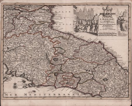 Decorativa carta geografica dell'Italia Centrale, pubblicata per la prima volta nel 1713 nel "Nouvelle Theatre Du Monde" con una bordura decorativa. Privo della cornice ornamentale, viene successivamente pubblicato a Leida nel 1714 nel ' Nouvelle atlas, trés-exact et fort commode pour toutes sortes de personnes, contenant les principales cartes géographique. Esemplare tratto dalla ristampa curata dagli editori Covens & Mortier verso il 1730 circa. Johannes Covens (1697-1774) è stato un editore geografico olandese con sede ad Amsterdam. È noto soprattutto per la sua collaborazione con l'editore Cornelis Mortier (1699-1783). Pierre Mortier il Vecchio (1661-1711) aveva ottenuto nel 1690 il privilegio di distribuire le opere dei geografi francesi nei Paesi Bassi. Dopo che la vedova continuò l'attività per alcuni anni, Cornelis ne assunse la direzione nel 1719. Nel 1721, Mortier si mise in società con Covens, che aveva da poco sposato la sorella di Cornelis. I due pubblicarono sotto il nome comune di Covens & Mortier. Nel 1774, alla morte del padre, Johannes Covens II (1722-1794) rilevò la quota paterna. Nel 1778, la società cambiò nome in J. Covens & Zoon, o J. Covens & figlio. L'azienda era specializzata nella pubblicazione di geografi francesi, tra cui De LIsle, Jaillot e Sanson. Pubblicarono anche atlanti, ad esempio una riedizione del 1725 dell'Atlas Major ' di Frederik de Wit e un atlante, con aggiunte, delle opere di Guillaume Delisle. Al suo apice, l'azienda possedeva la più grande collezione di stampe geografiche mai riunita ad Amsterdam. Acquaforte, coloritura coeva dei contorni in ottimo stato di conservazione. Decorativa carta geografica dell'Italia Centrale, pubblicata per la prima volta nel 1713 nel "Nouvelle Theatre Du Monde" con una bordura decorativa. Privo della cornice ornamentale, viene successivamente pubblicato a Leida nel 1714 nel ' Nouvelle atlas, trés-exact et fort commode pour toutes sortes de personnes, contenant les principales cartes géographique. Esemplare tratto dalla ristampa curata dagli editori Covens & Mortier verso il 1730 circa. Johannes Covens (1697-1774) è stato un editore geografico olandese con sede ad Amsterdam. È noto soprattutto per la sua collaborazione con l'editore Cornelis Mortier (1699-1783). Pierre Mortier il Vecchio (1661-1711) aveva ottenuto nel 1690 il privilegio di distribuire le opere dei geografi francesi nei Paesi Bassi. Dopo che la vedova continuò l'attività per alcuni anni, Cornelis ne assunse la direzione nel 1719. Nel 1721, Mortier si mise in società con Covens, che aveva da poco sposato la sorella di Cornelis. I due pubblicarono sotto il nome comune di Covens & Mortier. Nel 1774, alla morte del padre, Johannes Covens II (1722-1794) rilevò la quota paterna. Nel 1778, la società cambiò nome in J. Covens & Zoon, o J. Covens & figlio. L'azienda era specializzata nella pubblicazione di geografi francesi, tra cui De LIsle, Jaillot e Sanson. Pubblicarono anche atlanti, ad esempio una riedizione del 1725 dell'Atlas Major ' di Frederik de Wit e un atlante, con aggiunte, delle opere di Guillaume Delisle. Al suo apice, l'azienda possedeva la più grande collezione di stampe geografiche mai riunita ad Amsterdam. Acquaforte, coloritura coeva dei contorni in ottimo stato di conservazione. Cfr.