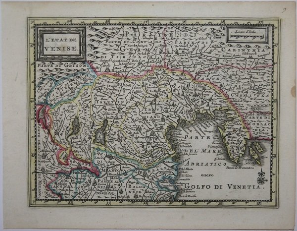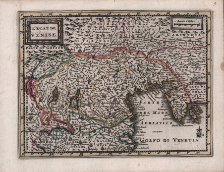 Rarissima mappa tratta dal "Nouveau Petit Atlas - Atlas soluagé de son gros pesant Fardeau" stampato a Leida, circa 1714. L’atlante è incredibilmente raro e solo una copia completa è conosciuta nella biblioteca di Leida, mentre Burden possiede solo il primo volume. L'atlante è composto di nove parti: una parte generale denominata "Nouveau Petit Atlas" e 8 parti con mappe di una certa regione ogni intitolato "Atlas Soulage de son gros e pesant Fardeau". Quasi tutte le mappe vengono stampate utilizzando e rielaborando le lastre di Janssonius per il suo "Atlas Minor", atlante di ispirazione mercatoriana che prima Hondius poi Janssonius ampliarono e aggiornarono. I titoli e la scala sono stati tradotti in francese. I cartigli sono stati modernizzati, con una forma tonda od ovale composta e delle rose dei venti aggiunte. Alcuni toponimi sono aggiunti, come si nota dalla diversa grafia incisa. Le carte dell’Italia provengono dall’ottava ed ultima parte dell’atlante, denominata “L’Atlas Soulagé de son gros & pesant fardeu: Ou NOUVELLES CARTES GEOGRAPHIQUES qui contiennent l’ITALIE, avec le Paryies principales qui la composent comme l’Etat del L’eglise, Naples, Sicile, &c. Ouvage propre pour Vouager commodement & agréablement des Yeux”. Lastra di rame con colore coevo, perfette condizioni. Grandissima rarità cartografica. A very rare map taken from the "Nouveau Petit Atlas - Atlas soluagé de son gros pesant fardeau" printed in Leiden circa 1714. The atlas is very rare and only one complete copy is known in the library of Leiden, while Burden old only the first volume. The atlas is composed of nine parts: a general part "Nouveau Petit Atlas" and 8 parts with maps of a certain region each titled "Atlas soulagé de son gros & pesant fardeau". Almost all maps are printed from reworked plates of Janssonius's "Atlas Minor". The titles and scale were translated into French. The cartouches have been modernized and windrose added. Copperplate with contemporary outline colour, perfect conditions. Great rarity. Cfr. Van der Krogt, Koeman's Atlas Neerlandici, Vol. III B, pp. 561/570, 352:51.