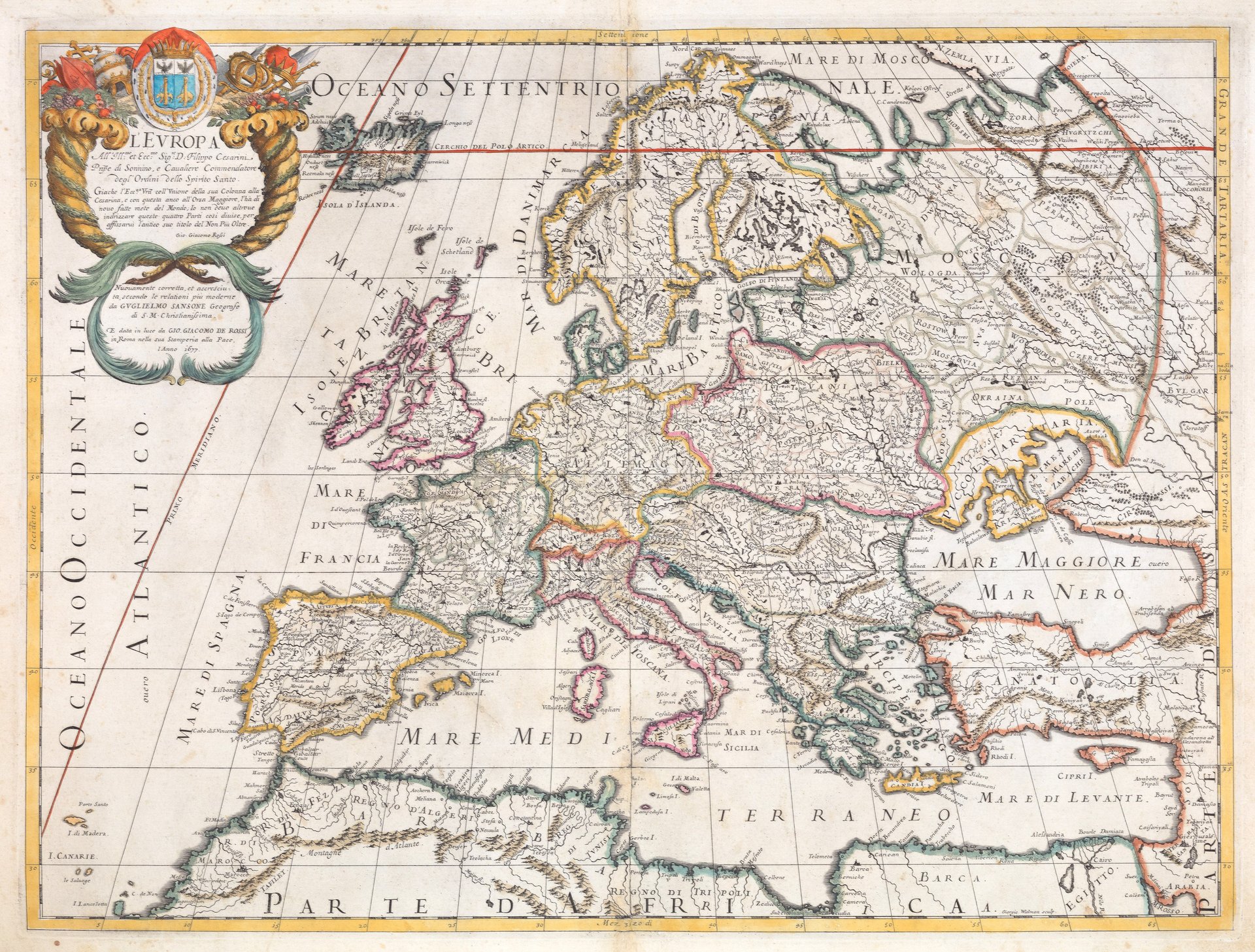 Incisione in rame, mm 410x550, dipinta a mano. Titolo impresso in alto entro cartiglio a sinistra, dati editoriali sotto al medesimo. Bella carta del continente edita da Giovanni Giacomo de Rossi (1627 - 1691) a Roma nel 1684 su modello del cartografo reale francese Nicolas Sanson d'Abbeville. Tratto dall'opera Il Mercurio Geografico, degli editori romani De Rossi e per la cura di Giacomo Cantelli da Vignola, geografo del Duca d'Este. L'atlante risulta edito dal 1660 al 1730 circa, nelle edizioni successive è arricchito da un numero sempre maggiore di carte; nel modello di Sanson risulta molto accurato l'apparato geografico e idrografico a scapito dell'aspetto decorativo, che in questo mappamondo assume un tono sobrio. Buon esemplare, piccoli difetti restaurati alla piega centrale <BR>