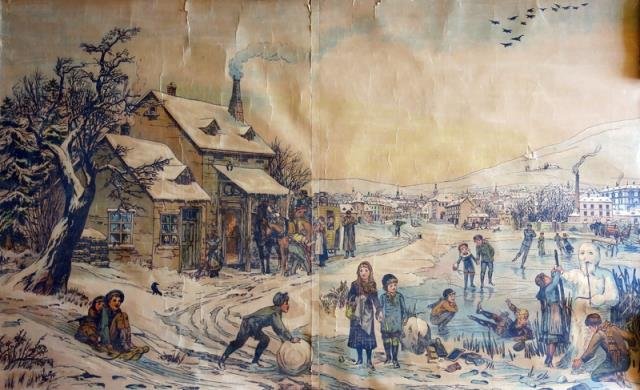 1900 circa. Cromolitografia applicata su tela, cm 104 x 139 (il foglio). L'Inverno è una piacevole e animatissima scena innevata, tanti bambini giocano su slittini, pattini da neve, fanno pupazzi; adulti al lavoro o si divertono anch'essi sui pattini; fa da cornice una cittadina con i fumi già propri dell'età industriale. Uniforme ingiallimento, difetti e strappi marginali.
