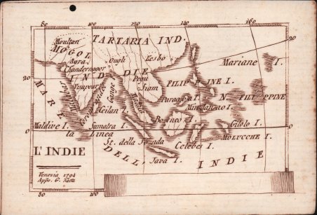 RARITA’ CARTOGRAFICA Sconosciuta piccola carta geografica con imprint di Giacomo Zatta e data 1794, appartenente a un non documentato atlante in miniatura dal titolo “Atlante tascabile per le dame”, suddiviso in tre tomi, stampati “IN VENETIA Presso G. Zatta”, senza data ma circa 1795. Si tratta di carte da visita – con un apposito spazio bianco dove apporre il proprio nome – dove compare l’imprint o di Pietro Zancon (accompagnato dalla data 1794) o di Giacomo Zatta (con data 1794 o 1795), che, come si legge sul frontespizio, risulta l’editore dell’opera. Possiamo ipotizzare che la serie, iniziata da Zancon fu poi terminata dallo Zatta. Sulla carta dell’Italia – presumibilmente la prima tavola dell’opera – compare stampato il nome di Chiara Minelli Rota, nobildonna veneziana che sposò Antonio Rota nel 1794; tutte le restanti 65 carte recano lo spazio bianco privo di nome. In precedenza, le carte erano note solo attraverso una serie, priva di imprint editoriale, venduta 21 anni fa (1999) dall’Antiquariaat Haas di Bedburg Hau; parlando con Stephan Haas, la serie, priva di titolo e dati editoriali si componeva di 70 mappe. Le carte furono vendute separatamente sotto il nome di G. Bonatti, firma dell’incisore che si trova nella carta della Francia. In seguito, le tavole furono attribuite a Pietro Zaricen da Geoffrey King (cfr. Miniature Antique Maps, p. 181). Il nome dello Zaricen viene dedotto dalla carta della contea del Roussillon, che reca l’iscrizione “Venezia 1794 App.o P. Zancon”, letto erroneamente come Zaricen. Lajos Szantai include la carta dell’Ungheria nella sua cartobibliografia, traducendo il nome dell’autore in Zancen (cfr. Atlas Hungaricus 1528-1850). Sempre King, che non menziona nessuna carta firmata da Zatta, sostiene che “About the turn of the century a signed card of the first edition, with a map of the province of Roussillon in the south of France, was seen at an Ephemera Society Fair in London”. Questo esemplare sembrerebbe oggi quello conservato alla Yale University Library [1978 351], che lo descrive composto da 70 carte geografiche. Non sappiamo se sia il numero totale delle mappe, e l’assenza di un indice o dell’elenco non consente di stabilire l’esatto numero delle carte che lo compongono. http://hdl.handle.net/10079/bibid/3611852Confrontando le carte erroneamente attribuite allo Zaricen ci si accorge che la lastra è abrasa in corrispondenza della firma di Zancon o Zatta. Molto scarse sono le notizie sulle carte che possiamo ora definire “ex Zaricen”. Jason Hubbard nella sua bibliografia recente sulle carte del Giappone raffigura la carta priva dell’imprint “App.o G. Zatta” attribuendola - sulla base delle informazioni bibliografiche finora note – a Giuseppe Bonatti e Pietro Zaricen: “This is one of the 70-odd geographical cards, printed on one side only, acquired by the Haas brothers in 1999. The cards cover countries around the world and include detailed map of Italian provinces. The card with the map of France carries the inscription: G. Bonatti fece; and it is presumed that Bonatti engraved all of them although this is questioned by King” (cfr. J. Hubbard, Japoniae Insulae, n. 124). Il nostro esemplare della carta della Francia, che reca l’imprint “Venezia 1794, App.o P. Zancon” reca in basso a destra la firma di Bonatti sopra menzionata. Dunque, l’unica differenza tra questa serie di sconosciute carte sembra essere la presenza degli imprint editoriali di Zancon e Zatta, accompagnati dalla data 1794 o 1795. Giuseppe Bonatti è menzionato da V. Valerio nella qualità di incisore cresciuto alla scuola Remondini di Bassano, autore di alcune carte per l’atlante di Pazzini Carli (Siena, 1788-1800) e per l’Atlante Geografico di Carlo Antonio Barbiellini (Milano, 1807). Dal 1809 in poi lavorò come incisore per il Deposito della Guerra di Milano (cfr. V. Valerio, Cartografi Veneti, p. 153). Pietro Zancon era, assieme . A GREAT RARITY Unknown small map with imprint by Giacomo Zatta and date 1794, belonging to an undocumented miniature atlas entitled “Atlante tascabile per le dame” (Pocket Atlas for ladies), divided into three volumes, printed "IN VENETIA Presso G. Zatta", undated but about 1795. A rare set of visiting cards published in Italy features pretty little maps of all parts of the world - with a special white space where to put your name - where the imprint appears or of Pietro Zancon (accompanied by the date 1794) or Giacomo Zatta (with the date 1794 or 1795), who, as can be read on the title page, is the publisher of the whole Atlas. We can speculate that the series, started by Zancon was later terminated by Zatta. On the map of Italy is printed - presumably the first map of the work - the name of Chiara Minelli Rota, Venetian noblewoman who married Antonio Rota in 1794; all remaining 65 maps bear the blank space without names. Previously, the maps were known only through a series, without editorial imprint, sold 21 years ago (1999) by the Antiquariaat Haas of Bedburg Hau; speaking with Stephan Haas, the series, without title and printing details, consisted of 70 maps. The maps were sold separately under the name of G. Bonatti, the engraver's signature found on the map of France. Later, the plates were attributed to Pietro Zaricen by Geoffrey King (see Miniature Antique Maps, p. 181). The name of Zaricen is derived from the Roussillon county map, which bears the inscription "Venice 1794 App.o P. Zancon", incorrectly read as Zaricen. Lajos Szantai includes the map of Hungary in his cartobibliography, translating the author's name into Zancen (see Atlas Hungaricus 1528-1850). Always King, who does not mention any map signed by Zatta, said: "About the turn of the century a signed card of the first edition, with a map of the province of Roussillon in the south of France, was seen at an Ephemera Society Fair in London ". This copy would seem to be the one preserved in the Yale 