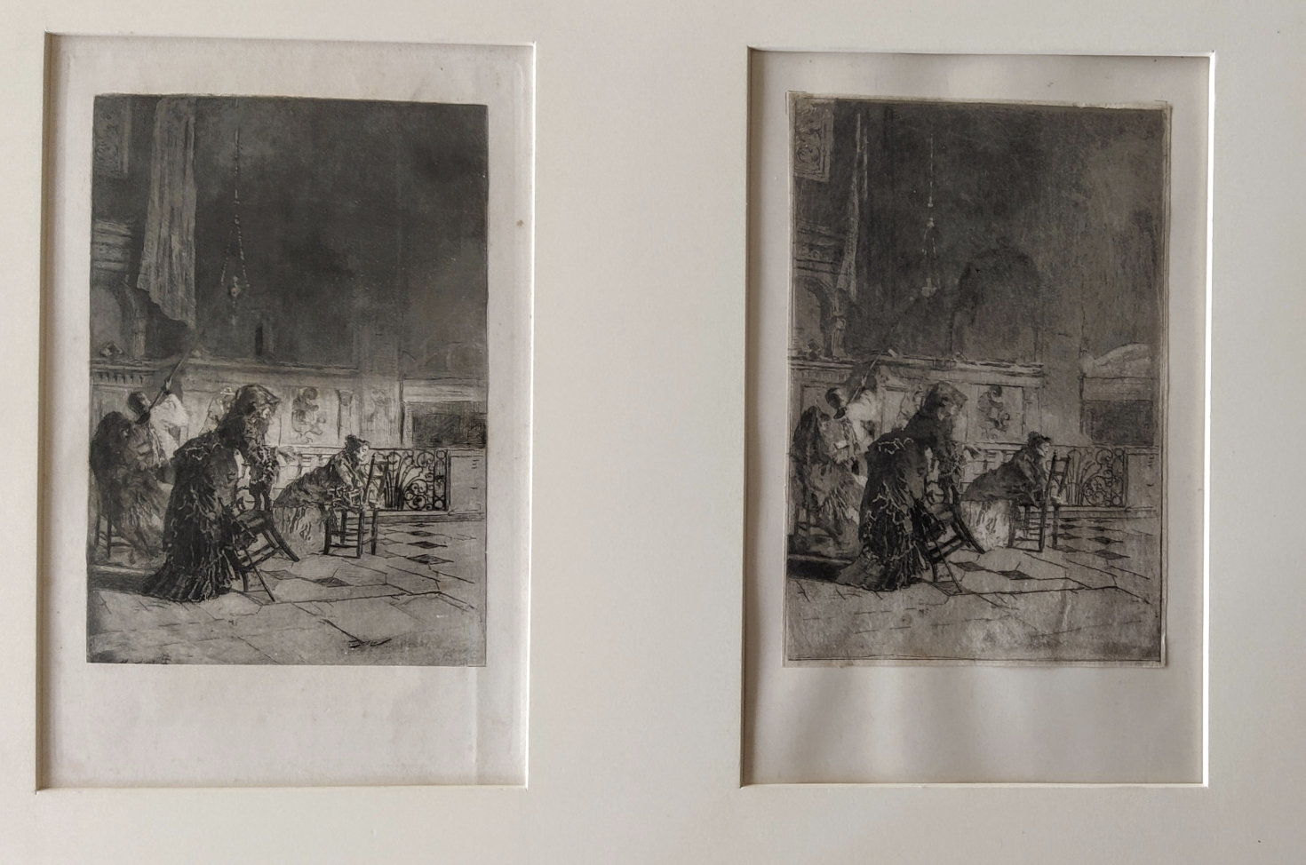Impressioni eccellenti entrambe con ampia morbida velatura di fondo. Nella prima immagine è più nitida e il tratto più deciso. Nella seconda, su carta applicata ad cartoncino, l'immagine è più evanescente, si notano chiaramente i segni di pulitura della lastra soprattutto nella parte alta della composizione.